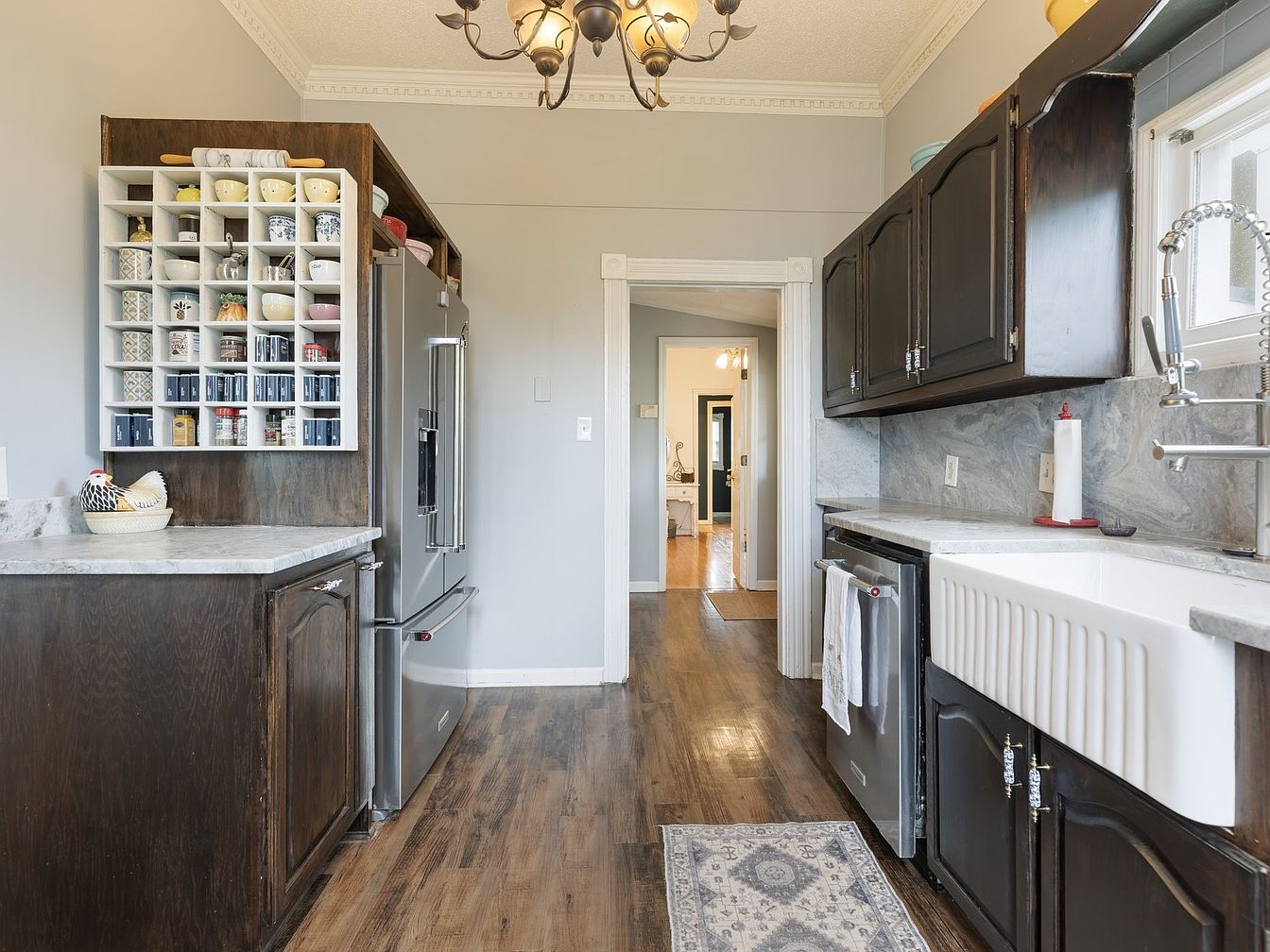 This kitchen features a harmonious blend of dark wood cabinetry and light marble countertops. The rich tones of the cabinet and the warm wooden flooring create an inviting atmosphere. A vintage farmhouse sink is accompanied by a modern faucet, enhancing functionality. Opposite, a unique open shelving unit displays colorful dishware and jars, adding a touch of character. Subtle gray walls complement the fixtures, while decorative crown molding elevates the space. Natural light streams through the window, brightening the area. An intriguing glimpse of the home is visible through the doorway, providing a sense of continuity in design.
