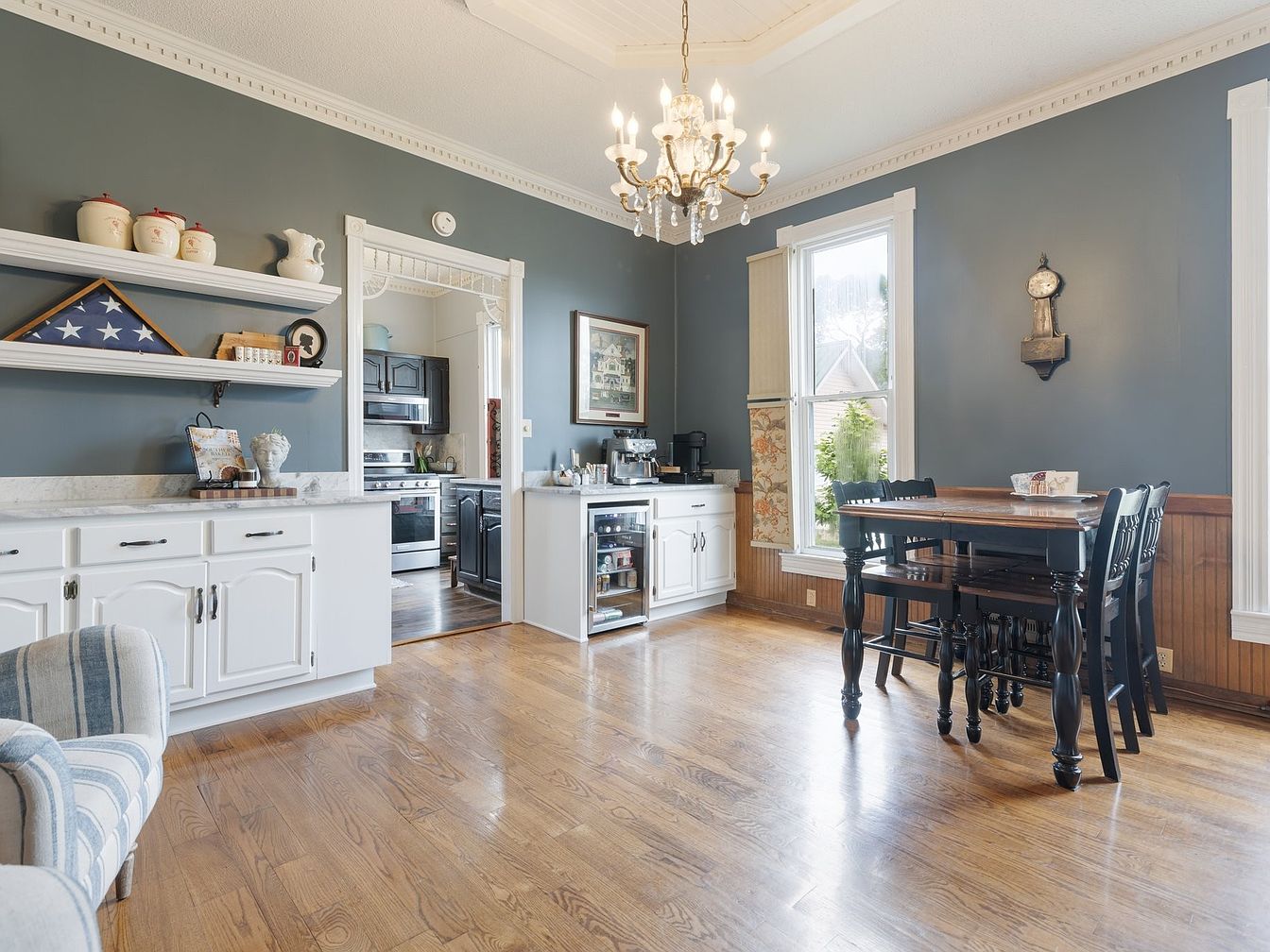 The space features a cozy dining area with a rich wooden floor, complemented by a dark wooden dining table surrounded by black chairs. The walls are painted a calming blue-grey, providing a modern backdrop to the traditional aesthetic. White cabinetry with vintage hardware stands out against the darker wall, housing decorative items and kitchen essentials. A charming chandelier hangs from the ceiling, illuminating the area with a warm glow. Large windows adorned with soft drapes invite natural light, while an antique clock adds a nostalgic touch. The overall decor integrates elements of both comfort and elegance.
