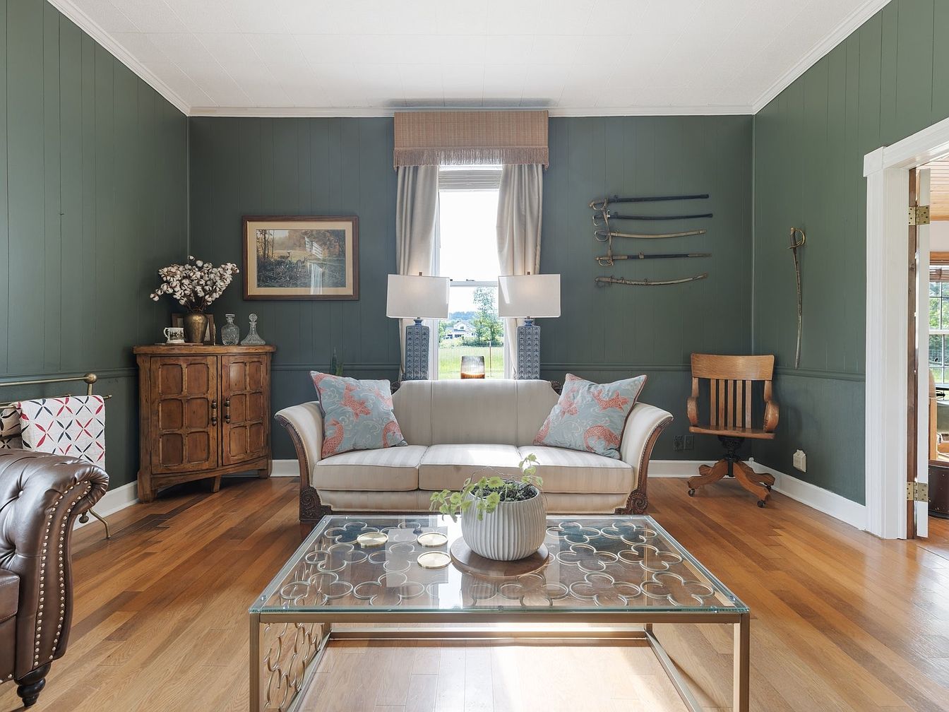 The living room features rich, dark green walls that create an inviting atmosphere, enhanced by ample natural light from a nearby window draped with soft gray curtains. A vintage-style white sofa, adorned with decorative cushions, stands elegantly in the center, complemented by a stylish glass-topped coffee table with a gold base. A wooden cabinet, showcasing a collection of decorative items, adds character, while vintage swords displayed on the wall contribute to the historic charm. The warm hardwood flooring brings warmth to the space, which is tastefully arranged for comfort and aesthetic appeal.