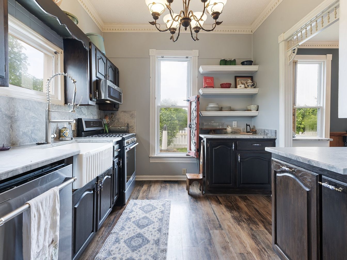 This kitchen features a blend of contemporary and vintage aesthetics. Dark wood cabinets contrast with a white farmhouse sink and marble countertops. A sleek stove and microwave are integrated with modern appliances. Natural light pours through two large windows adorned with simple curtains, enhancing the airy feel. The walls are painted in soft gray, complementing the rustic hardwood floor. Open shelving neatly displays colorful dishes, adding character to the space, while a patterned runner brings warmth underfoot. A classic chandelier hangs above, providing ambient lighting and embodying a charming yet functional kitchen atmosphere.