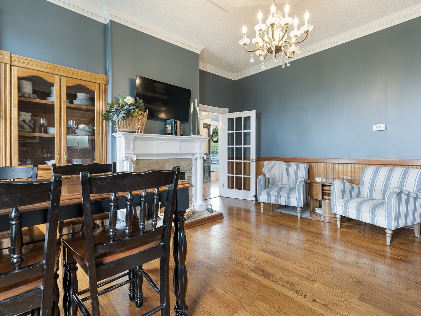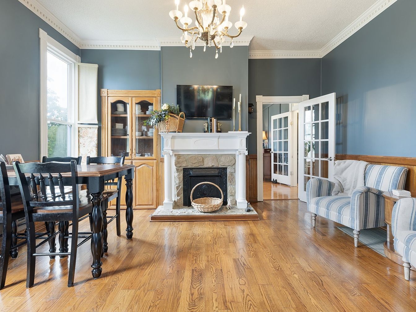 This living room captures a blend of modern comfort and historic charm. The walls are painted a calming shade of blue, contrasting beautifully with the warm wooden flooring. A stylish chandelier hangs from the ceiling, providing soft illumination. In one corner, a wooden dining table with black chairs invites casual gatherings, while a tall glass-front cabinet showcases dishware. The elegant fireplace, framed by white columns and a stone facade, serves as a focal point, complemented by a decorative basket. Near the fireplace, a cozy striped armchair sits, offering a relaxed seating option, enhancing the inviting atmosphere.