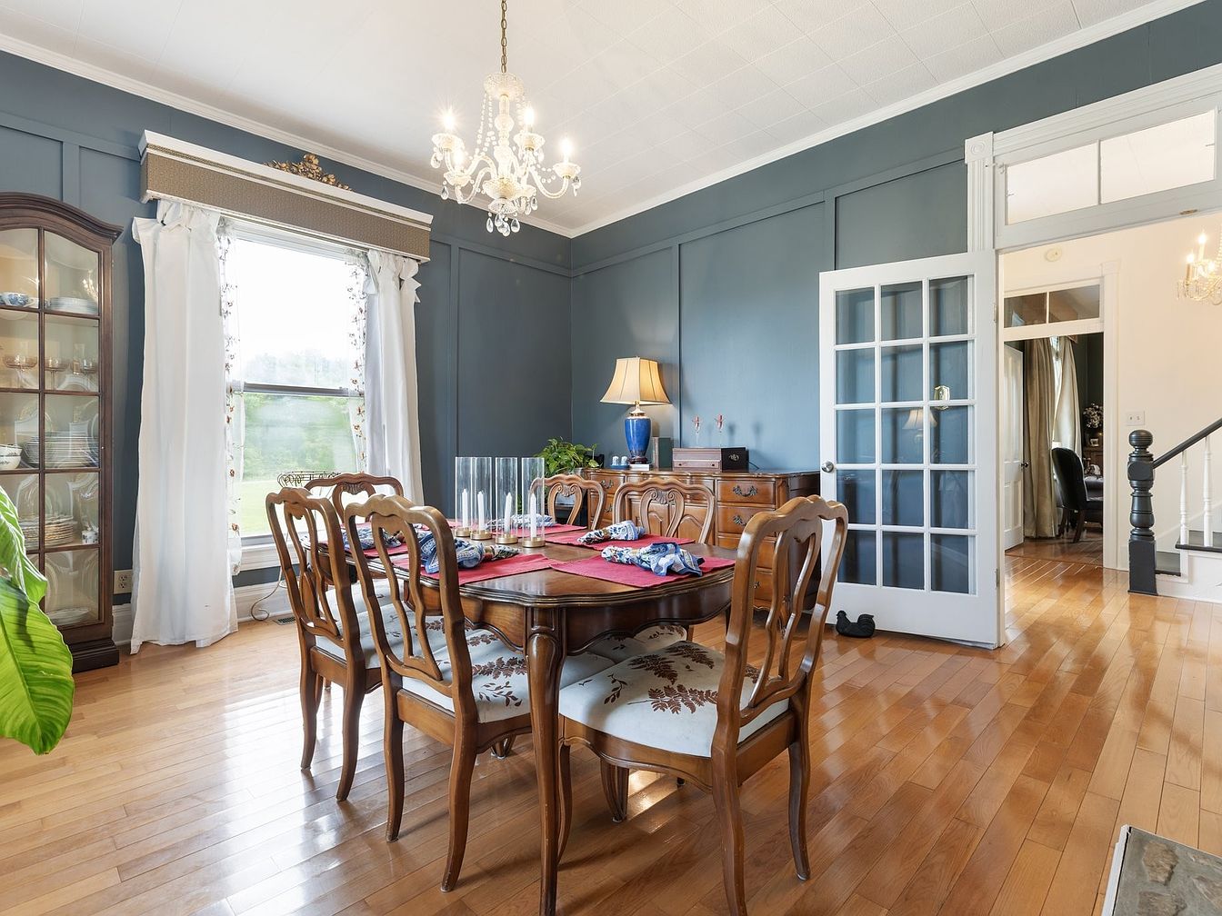 The dining room features a classic wooden table surrounded by elegantly carved chairs, each with upholstered seats displaying floral patterns. The soft gray-blue walls create a calming atmosphere, complemented by the rich warmth of polished hardwood flooring. A beautiful chandelier hangs from the ceiling, illuminating the space with a gentle glow. Large windows adorned with sheer white curtains allow natural light to flow, enhancing the room’s brightness. In the corner, a glass-front cabinet displays fine china, adding a touch of elegance. A small potted plant brings life to the setting, creating a welcoming yet refined dining experience.