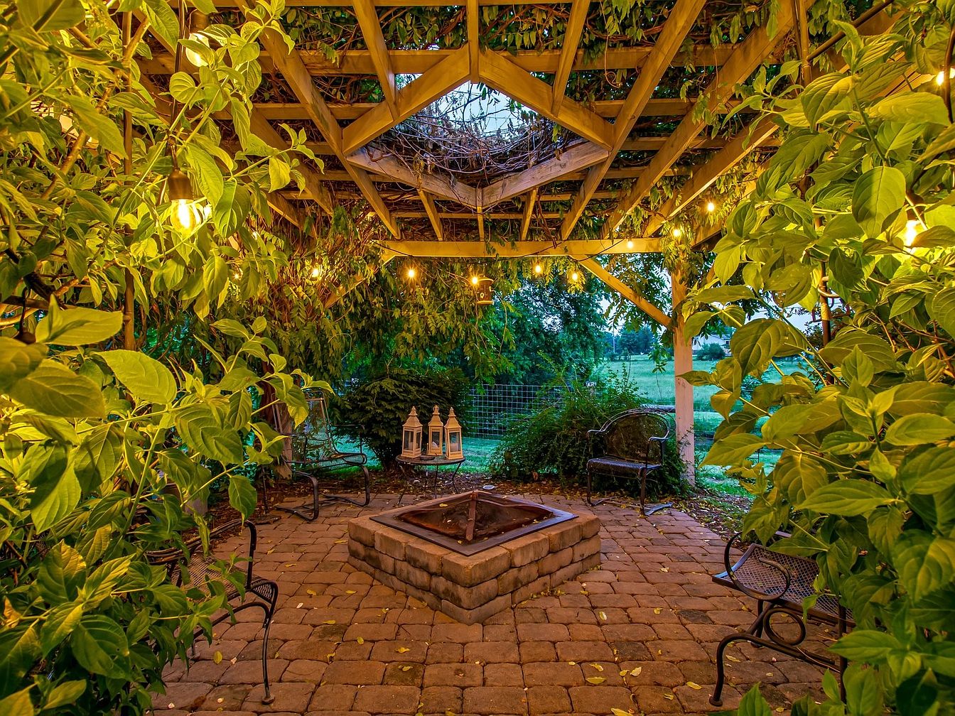 This outdoor patio area features a charming fire pit surrounded by stone seating, providing a perfect spot for gatherings. The space is framed with a wooden trellis draped in lush greenery, creating an intimate atmosphere. Soft, warm lighting from hanging bulbs enhances the mood, especially as dusk approaches. Paved with patterned stones, the ground offers a rustic yet elegant look. Metal chairs featuring intricate designs are positioned around the fire pit, inviting relaxation. The surrounding foliage and open landscape instill a sense of tranquility, making it an ideal setting for outdoor entertaining or quiet evenings.