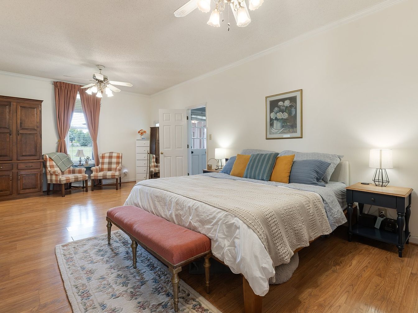 A spacious bedroom featuring a soothing color palette of soft whites and light browns. The centerpiece is a plush bed adorned with a textured blanket and vibrant pillows in varying shades of blue and gold. A strategically placed pink bench offers additional seating at the foot of the bed. Dark wood furniture, including a large armoire and nightstand, contrasts beautifully with the light-colored walls and rich brown flooring. Natural light floods the room through a window dressed with elegant curtains, while a piece of floral artwork adds character. Two comfy checkered armchairs invite relaxation.