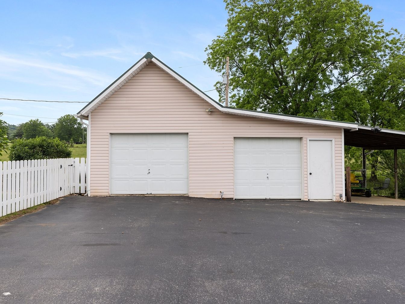 The garage showcases a light pink exterior, providing a soft and welcoming appearance. Featuring two large, white garage doors, it adopts a functional yet charming character. A smaller side door ensures accessibility while maintaining symmetry. The roof is pitched and covered with shingles, adding depth to its design. The driveway is paved with dark asphalt, contrasting with the pastel facade. A white picket fence runs alongside, enhancing the home’s overall quaint appeal. Lush greenery surrounds the property, framing the structure and creating a tranquil outdoor environment.