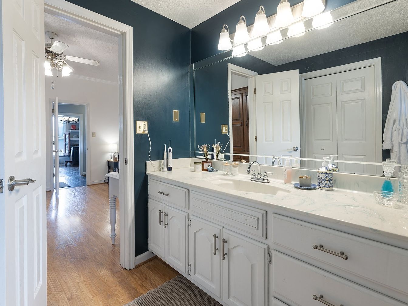 The space features a stylish bathroom with a spacious vanity topped with a marble countertop, showcasing subtle veining. Below the sink, white cabinetry contrasts elegantly with a deep navy blue accent wall that adds depth to the room. Fixtures include polished chrome faucets that enhance the modern aesthetic. Bright, multi-bulb vanity lighting illuminates the area, reflecting in the large mirror above the sink. To the left, a white door leads to additional rooms, while a plush area rug adds warmth. Accessories, including decorative containers and toiletries, are neatly arranged, completing the organized, inviting atmosphere.