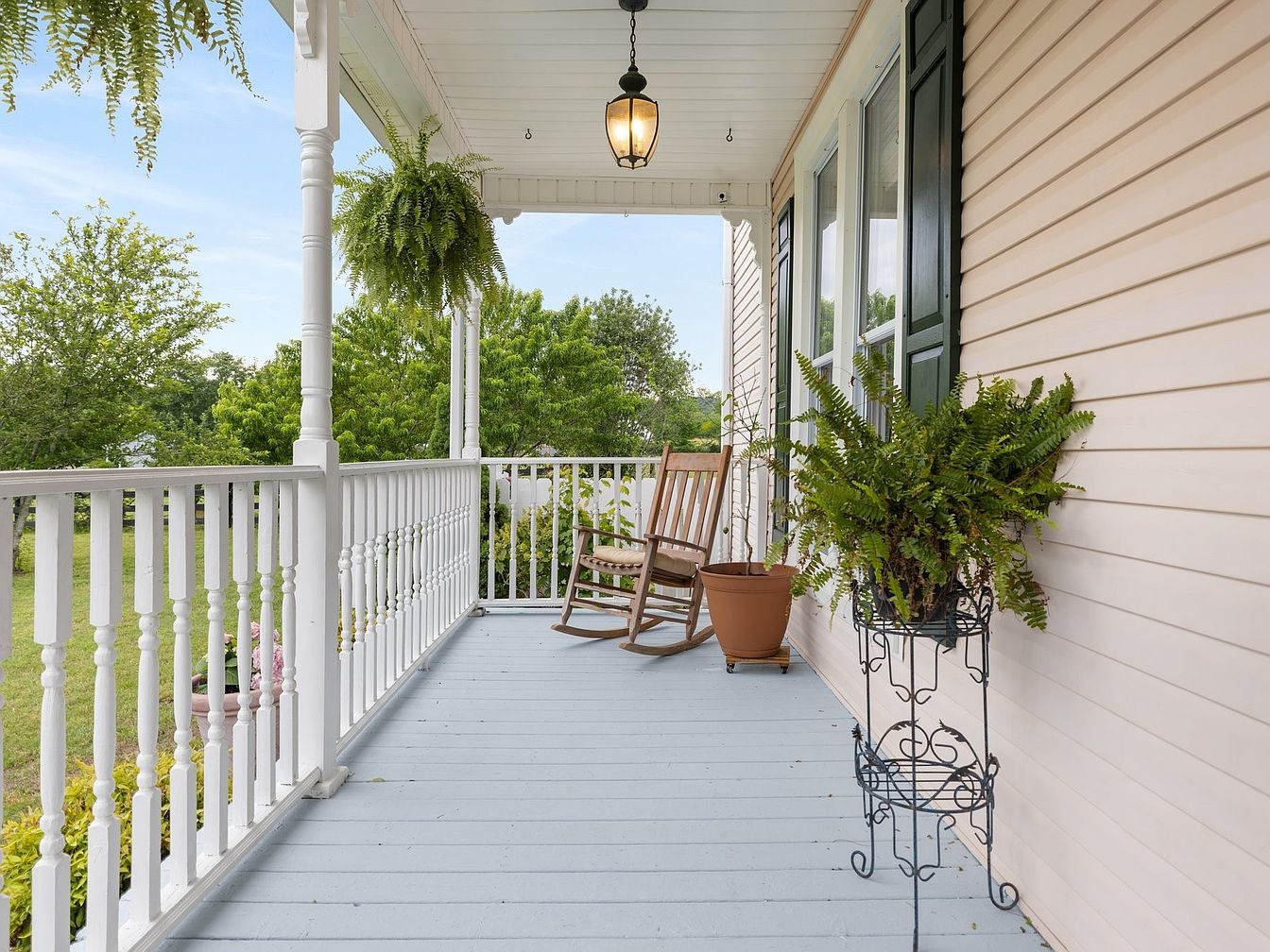 A charming front porch characterized by a light blue wooden floor, offering a serene setting. The white railing features spindle balusters, enhancing the classic aesthetic. A rustic rocking chair invites relaxation, positioned next to a potted fern in a terracotta container, adding a touch of greenery. An ornate metal plant stand holds another lush fern, serving as an eye-catching detail. The white siding of the house contrasts with dark green shutters on the windows, creating a fresh color palette. A pendant light hangs above, combining functionality with elegance while illuminating this welcoming outdoor space.