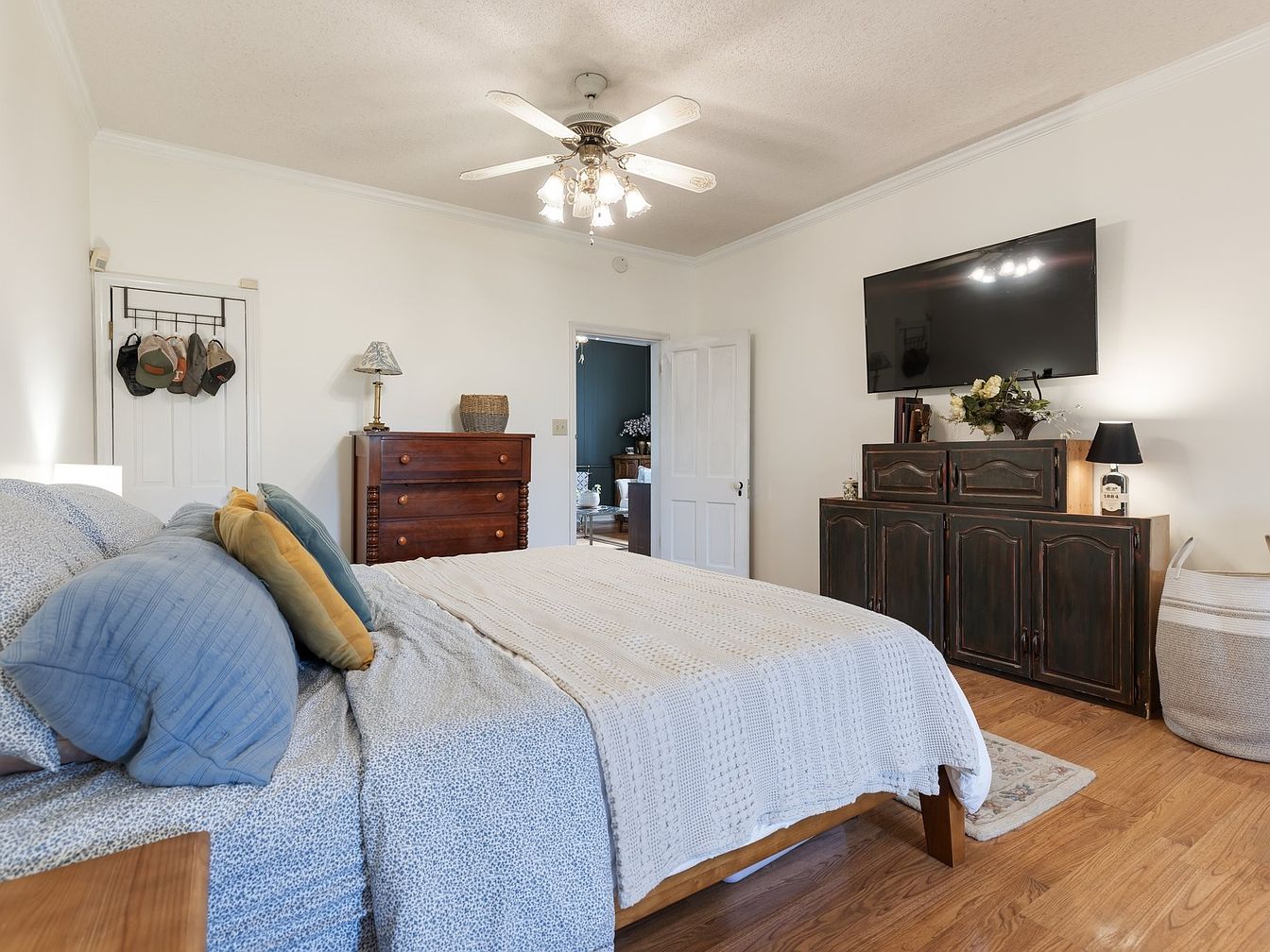 This cozy bedroom features a spacious layout with a comfortable king-sized bed adorned with textured bedding, including a knitted white throw and colorful pillows in shades of blue and yellow. A large flat-screen TV is mounted above a rustic wooden cabinet, which adds an element of warmth and charm. The hardwood flooring complements the room’s inviting atmosphere. An accent chair sits nearby, while a soft area rug lies beneath. Wall sconces and a ceiling fan with a light fixture provide ample illumination. Personal touches, like a hat rack and bedside lamp, create an inviting, functional space ideal for relaxation.