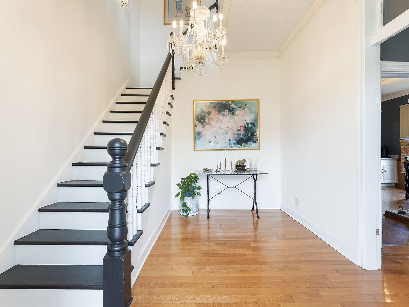 The entryway features a classic staircase with elegant black and white contrasting steps, accentuated by a polished black handrail. Warm, honey-toned hardwood flooring stretches across the space, inviting guests inside. A statement chandelier hangs from the ceiling, providing soft illumination. An abstract painting in vibrant colors adorns the wall beside the staircase, adding a modern artistic touch. To the side, a delicate black console table complements the aesthetic, adorned with simple decorative items and a potted plant in a blue and white ceramic pot. This blend of traditional and contemporary design elements creates a welcoming ambiance.