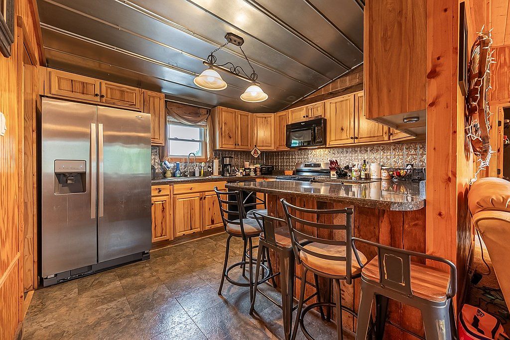 The kitchen features a warm, rustic aesthetic characterized by wooden cabinetry and a stone-patterned floor. A large stainless steel refrigerator stands adjacent to matching dark countertops, while dark appliances, including a microwave, blend seamlessly into the cabinetry. The color scheme centers on natural wood tones, adding warmth and coziness. Overhead, pendant lighting illuminates the central island, which is surrounded by metal bar stools, enhancing the inviting atmosphere. A window offers natural light, highlighting the intricate backsplash. The overall layout promotes functionality, with ample counter space for cooking and entertaining.