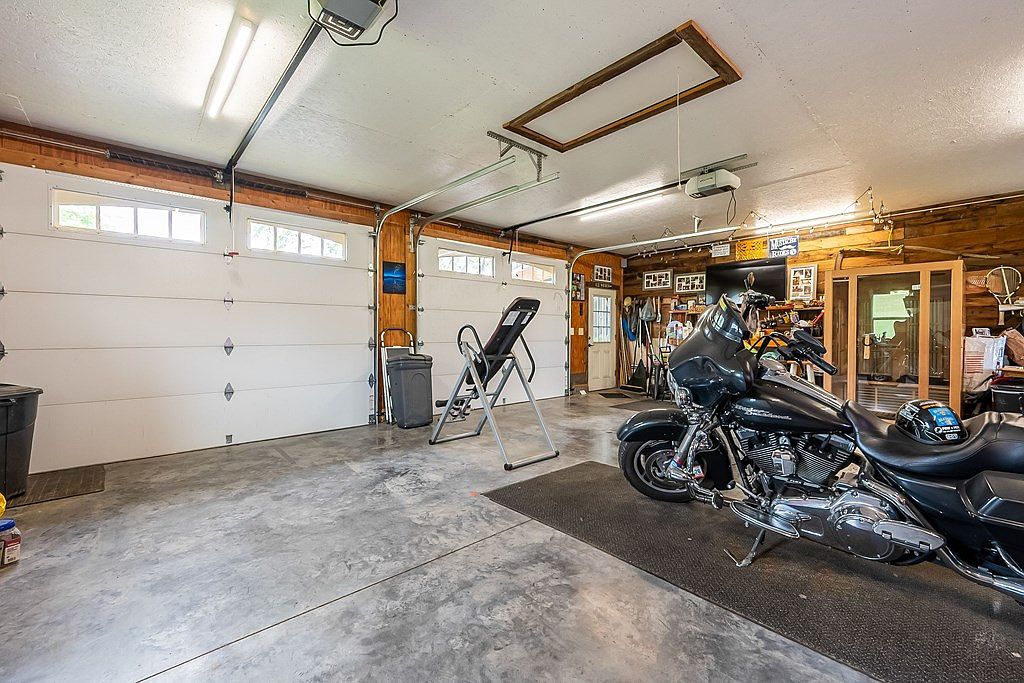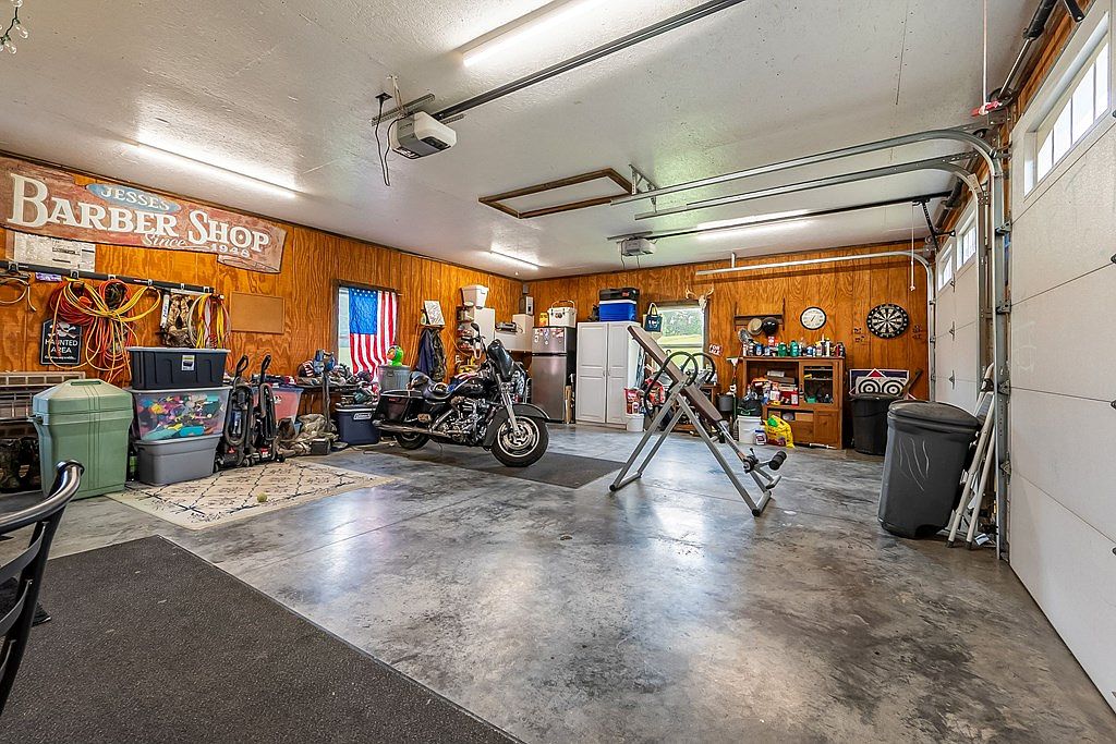 This garage features a practical layout with an extensive polished concrete floor, ideal for various activities. The wooden paneling adds warmth, while vibrant elements such as the ‘Jesse’s Barber Shop’ sign and an American flag embellish the walls. Numerous storage containers and equipment are neatly arranged, showcasing a functional yet lived-in vibe. A motorcycle occupies a prominent spot, indicating a passion for biking. The cluttered shelves filled with tools and supplies highlight a resourceful space. Additionally, the overhead lighting maintains brightness, making it conducive for work. A dartboard hints at recreational leisure within this multifunctional area.