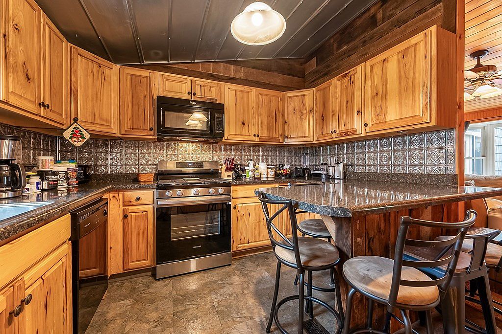 This kitchen features a warm, rustic design with rich wooden cabinetry and contemporary black appliances. The cabinets exhibit a natural wood finish, contrasting beautifully with the textured, metallic backsplash that adds depth and character to the space. A dark granite countertop provides a sleek workspace, complemented by circular bar stools with neutral upholstery, inviting casual dining or conversation. The ceiling showcases a mix of wood and metal elements, enhancing the homey atmosphere. Natural light floods in from an adjacent living space, creating an airy feel and highlighting the textures in the cabinetry and tile work.