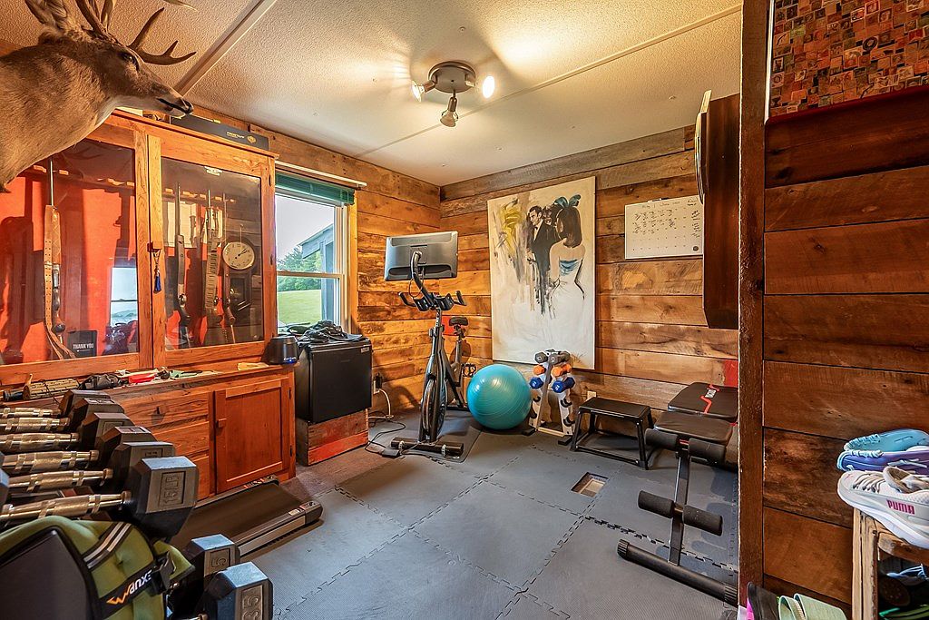 This room features a rustic home gym with wooden walls that evoke a cozy, cabin-like atmosphere. A large window allows natural light to flood the space, complementing the warm tones of the wood. Equipment includes a stationary bike and weightlifting bench, surrounded by dumbbells in various sizes. A vibrant exercise ball adds a pop of color. Additionally, a mounted television provides entertainment, while artistic decor, including a striking painting of a couple, adds uniqueness. Shelving with various fitness items and a display case with rifles hint at personal interests, blending functionality with character in this multi-purpose room.