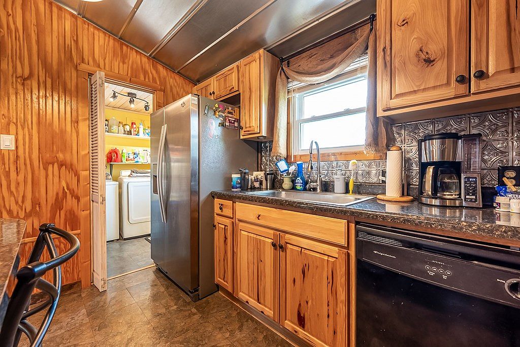 This kitchen merges rustic charm with functional design. The wooden paneling adds warmth, while the contemporary stainless steel refrigerator contrasts with natural wood cabinetry. A textured metallic backsplash reflects light, enhancing the cozy atmosphere. Ample counter space, including a dark granite surface, is perfect for meal prep, accompanied by a simple sink and modern coffee maker. Natural light filters through a window draped with soft curtains, harmonizing the earthy tones. To the left, a doorway leads to a compact laundry area, emphasizing practicality. The layout promotes easy movement, creating an inviting space for both cooking and casual dining.