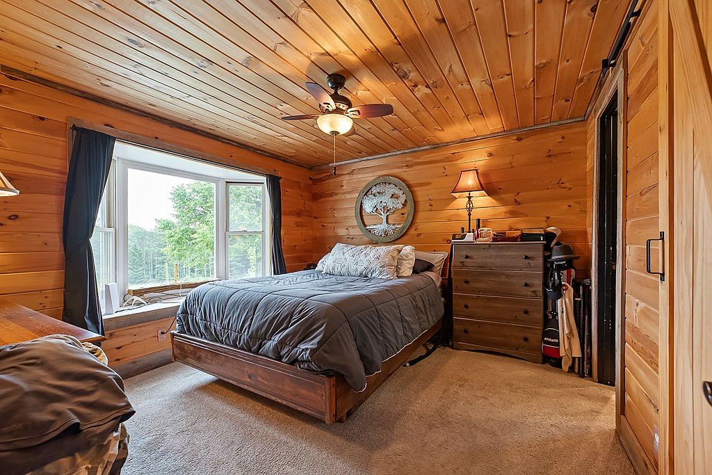 This cozy bedroom features warm wooden paneling accentuated by a sloped ceiling, creating a rustic yet inviting atmosphere. A large window provides natural light and offers a view of greenery outside, framed by dark curtains that add contrast. The bed, dressed in a dark gray comforter, is complemented by decorative pillows, and a wooden dresser is situated nearby, enhancing the room’s functionality. A bedside lamp casts a soft glow, while a round wall art piece featuring a tree motif adds character. The plush carpet underfoot adds warmth, uniting the room’s earthy tones with a sense of comfort.