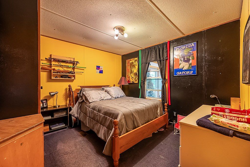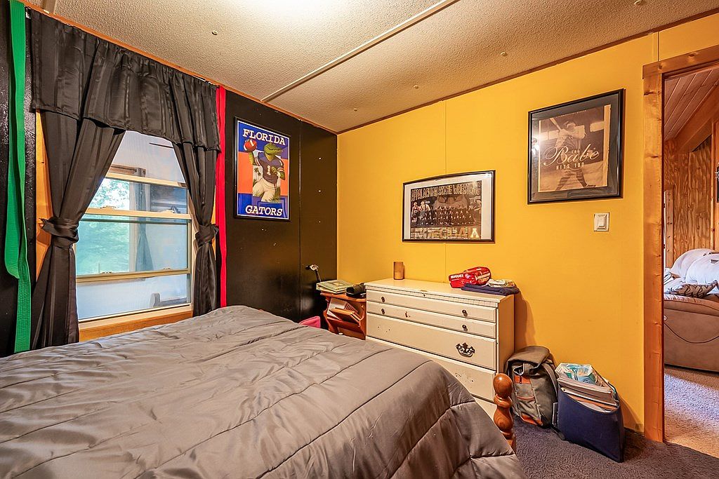 In this cozy bedroom, a full-sized bed with a dark gray comforter takes center stage, flanked by walls painted in warm yellow and black accents. The window draped with thick black curtains allows natural light to filter through, highlighting a poster of the Florida Gators. Nearby, a white dresser features vintage hardware, showcasing its classic design. Art pieces, including framed photographs, hang on the walls, adding personality to the space. A corner reveals a partially visible soft couch, suggesting a welcoming area for relaxation. This intimate space blends comfort with a youthful energy, making it ideal for restful nights.