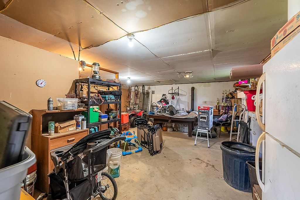 This garage space features a practical, utilitarian design, characterized by its bare, unfinished ceilings and ample overhead lighting. A variety of shelving units line the walls, filled with tools, storage bins, and household items, showcasing a blend of organization and scattered clutter. The floor is a basic concrete slab, with a few signs of wear. Various items, including a stroller, bicycles, and an upright freezer, contribute to the area’s multifunctional purpose. A clock hangs on the wall, emphasizing the informal, working environment. The overall feel reflects a space primarily used for storage and everyday activities.