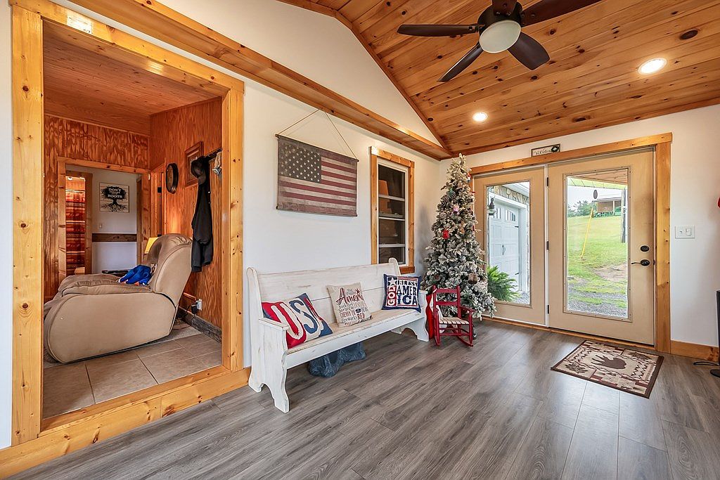 This entryway features a cozy and inviting atmosphere. Light wood walls and a ceiling with exposed wooden beams create warmth, complemented by the grey laminate flooring. To the left, a plush beige recliner invites relaxation. An American flag hangs on the wall, embodying a patriotic theme. A white bench with colorful cushions adds charm and function, while a small red chair holds a decorated Christmas tree, enhancing seasonal spirit. Large sliding doors provide a view of the outdoors, bringing in natural light. Functional elements like a coat rack and decorative pieces complete this homey space.