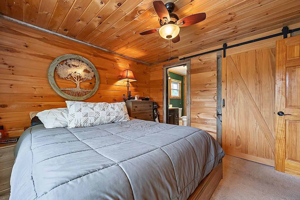 This cozy bedroom features warm, honey-colored pine walls and a ceiling, creating an inviting, rustic atmosphere. A plush, gray comforter covers the bed, accented by a decorative, geometric patterned pillow. A round wall art piece depicting a tree adds a natural element, while a bedside lamp casts a soft glow. A wooden dresser sits beside the bed, offering functional storage. The room’s design incorporates a sliding barn door leading to a bathroom, framed by a wooden track, emphasizing the rustic theme. The muted colors and wooden textures contribute to a tranquil and homely sanctuary.