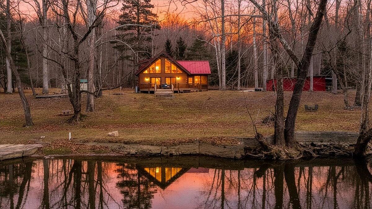 Discover a charming log cabin with natural wood finishes, offering serene riverfront views and rustic elegance.