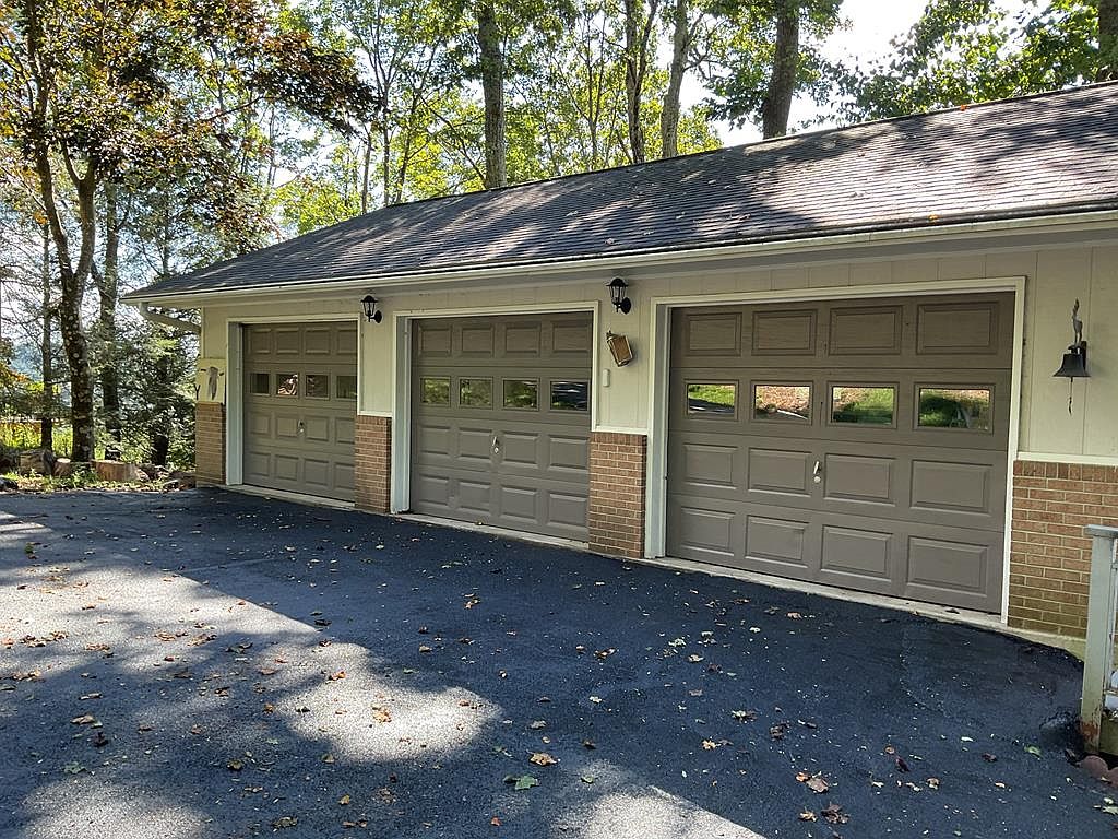 This spacious garage features three large, beige garage doors with rectangular window panels, enhancing visibility and light. The exterior combines smooth siding with a warm brick base, creating a harmonious aesthetic. The sloped roof has dark shingles, complementing the muted tones of the siding. Two wall-mounted lights flank the garage doors, adding charm and functionality. A paved driveway leads smoothly to the garage, bordered by a natural landscape of trees with green foliage, providing a serene backdrop. Leaves scattered on the driveway indicate the changing seasons, adding a touch of nature’s beauty to this practical space.