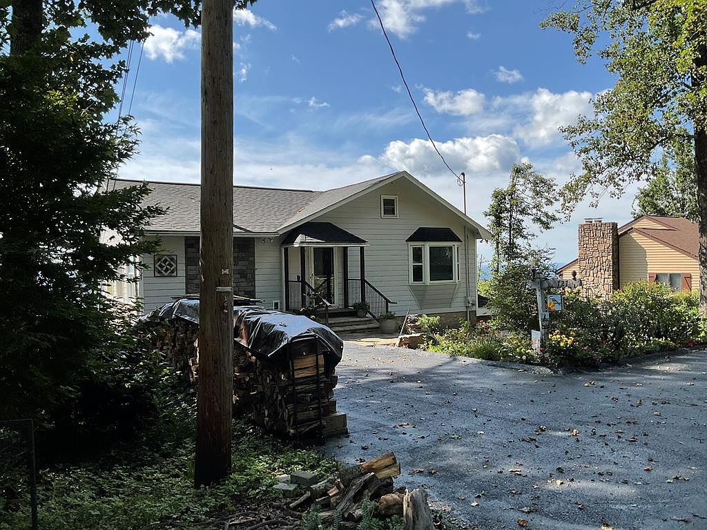A charming entrance showcases a single-story home with a light siding accentuated by dark roofing. The porch features angled steps leading up to an inviting entryway, framed by large windows that enhance natural light. Surrounding trees and shrubs provide a lush backdrop, harmonizing with the rustic stacked wood nearby. A stone column adds depth to the façade, while a flat-roof shelter leads to the door, creating a cozy porch atmosphere. The driveway is paved, lined with carefully arranged landscaping, making the space feel welcoming. Blue skies and scattered clouds contribute to the serene ambiance of the setting.