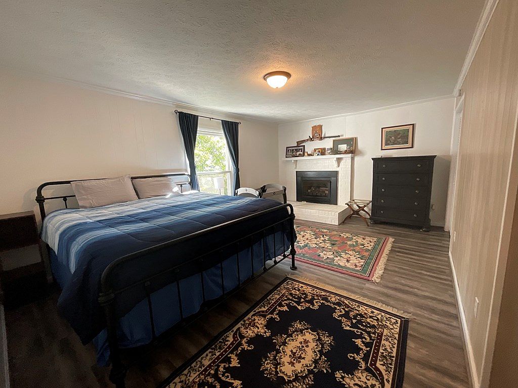 This cozy bedroom features a spacious layout centering around a black metal bed with a blue and white striped comforter, complemented by neutral pillows. An adjacent nightstand provides a practical touch. To one side, a tall black dresser contrasts with the light wood flooring. A decorative fireplace, framed by white brick, adds warmth and character to the room. Above the mantel, a curated display of framed pictures personalizes the space. Natural light floods through large windows, dressed with deep blue curtains, enhancing the soft ambiance. Rich, patterned area rugs add a touch of elegance to the hardwood floor.