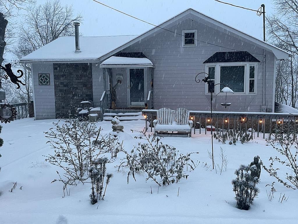 The front exterior of a home is blanketed in fresh snow, revealing a cozy winter scene. The house features a blend of wood and light-colored siding, accented by a stone veneer. Two iconic Adirondack chairs sit invitingly on a deck, surrounded by snow-covered shrubs and ornamental plants. A lantern casts a warm glow near the entrance, enhancing the inviting atmosphere. The large front window offers a glimpse of warmth inside, while the roof extends sharply, suggesting protection from the elements. This charming exterior showcases a harmonious balance between natural elements and architectural beauty.
