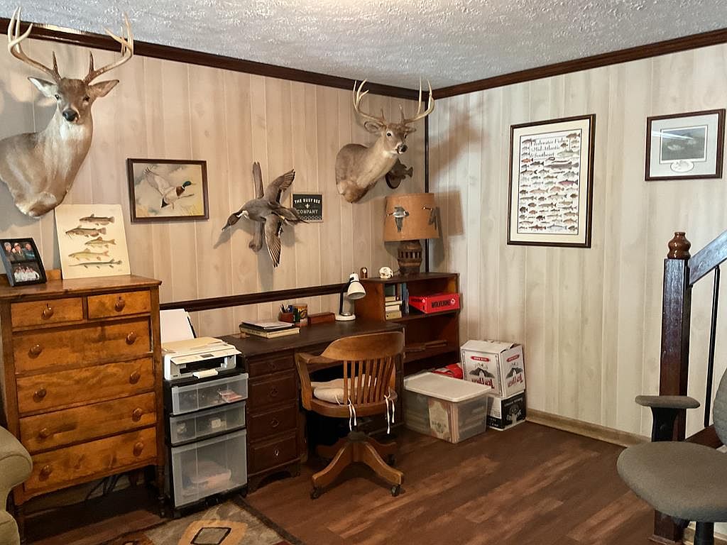 This space features rustic aesthetics characterized by wooden tones and nature-inspired decor. The walls are lined with light-colored paneling, enhancing the cozy, inviting atmosphere. Mounted deer heads and a duck add a hunting theme, complemented by framed artwork of fish and birds, showcasing outdoor interests. A wooden dresser with ornate knobs stands prominently, while a dark wooden desk provides a workspace, accompanied by a comfortable, rotating chair. A lamp rest on the desk, casting a warm glow over the area. The flooring is dark and polished, adding depth to the space, which feels homey yet functional.