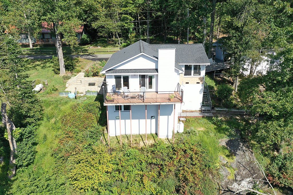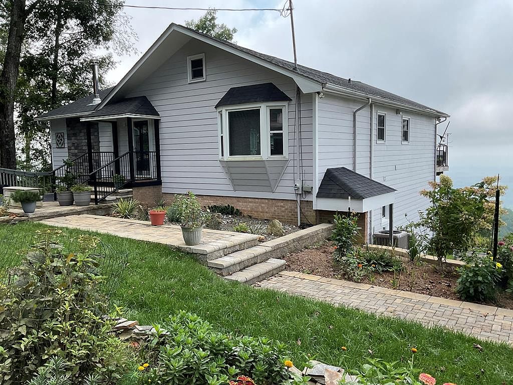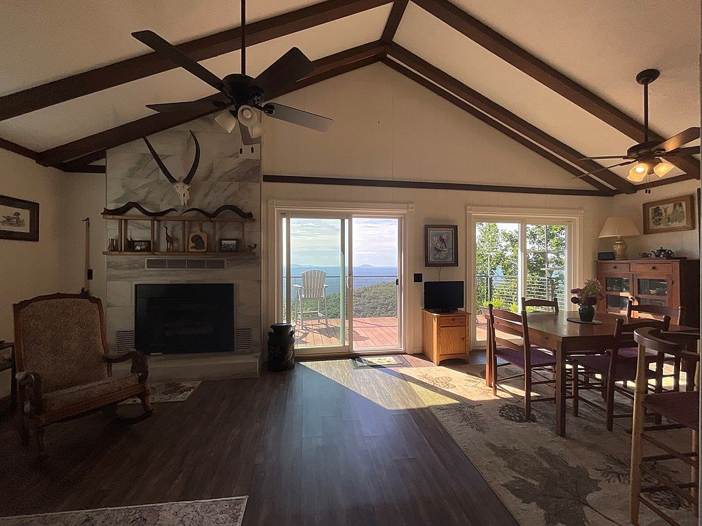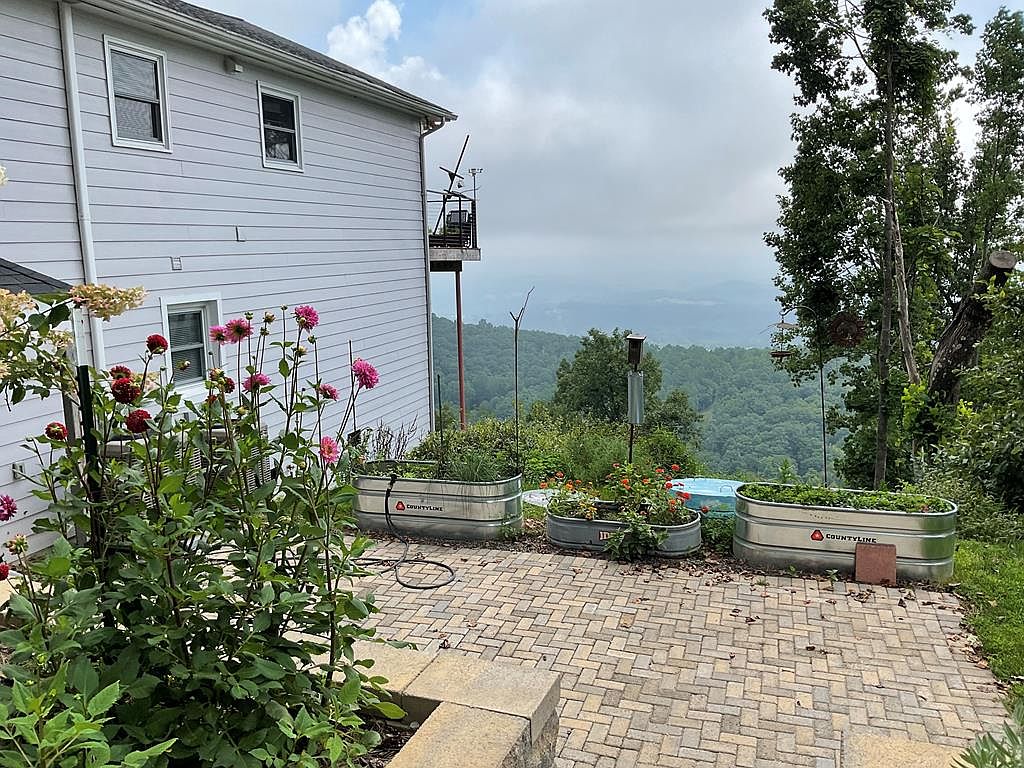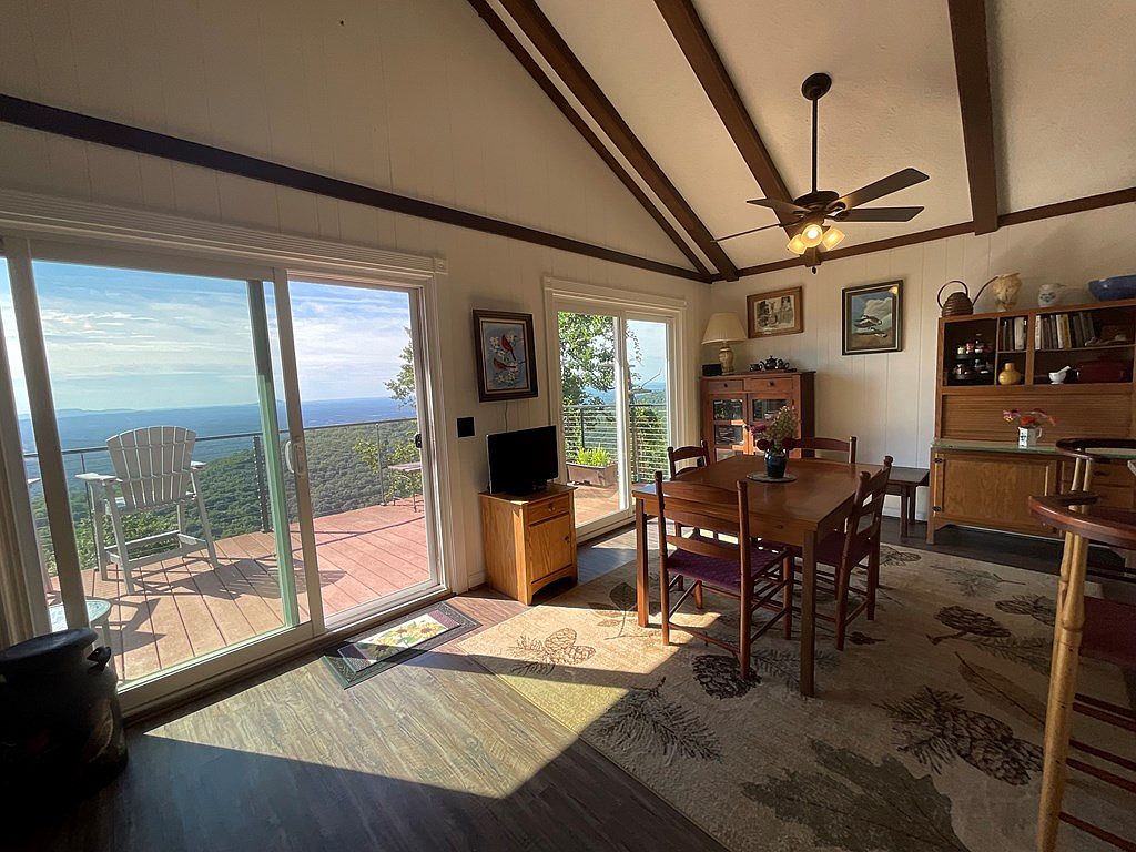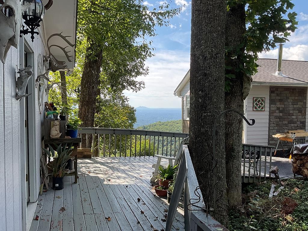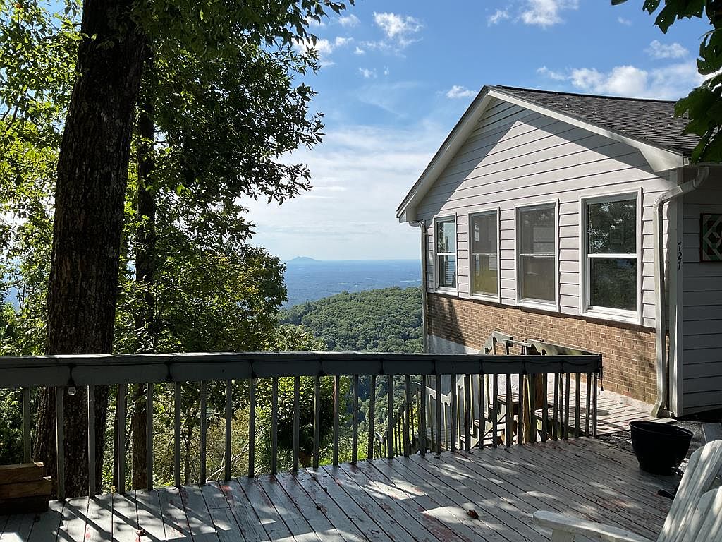 This patio offers a stunning panoramic view of the surrounding mountains and valleys. The space features a rustic wooden deck with a weathered finish, blending seamlessly with the natural environment. A sturdy railing provides safety while enhancing the outdoor aesthetic. The house is adorned with light-colored siding and brick accents, complementing the warm wood tones. Large windows allow ample sunlight to flood the interior, providing a bright and airy feel. Lush greenery surrounds the area, adding to the tranquility. This space emphasizes outdoor living, making it ideal for relaxation or gatherings amidst nature’s beauty.