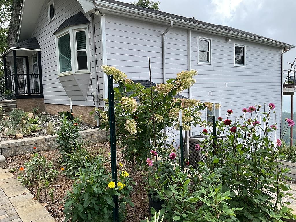 The image captures a charming garden adjacent to a modern home. The house features light gray siding and a dark roof, blending contemporary design with outdoor aesthetics. The corner includes a welcoming porch with black railings, adding elegance. A well-maintained garden bursts with colorful blooms, including marigolds, dahlias, and hydrangeas, creating a vibrant atmosphere. The path, constructed with stone pavers, leads to the landscaped yard, showcasing native plants and a few rocky accents. This space invites relaxation and appreciation of nature, thoughtfully integrating residential comfort with flourishing greenery, enhancing the overall charm of the property.