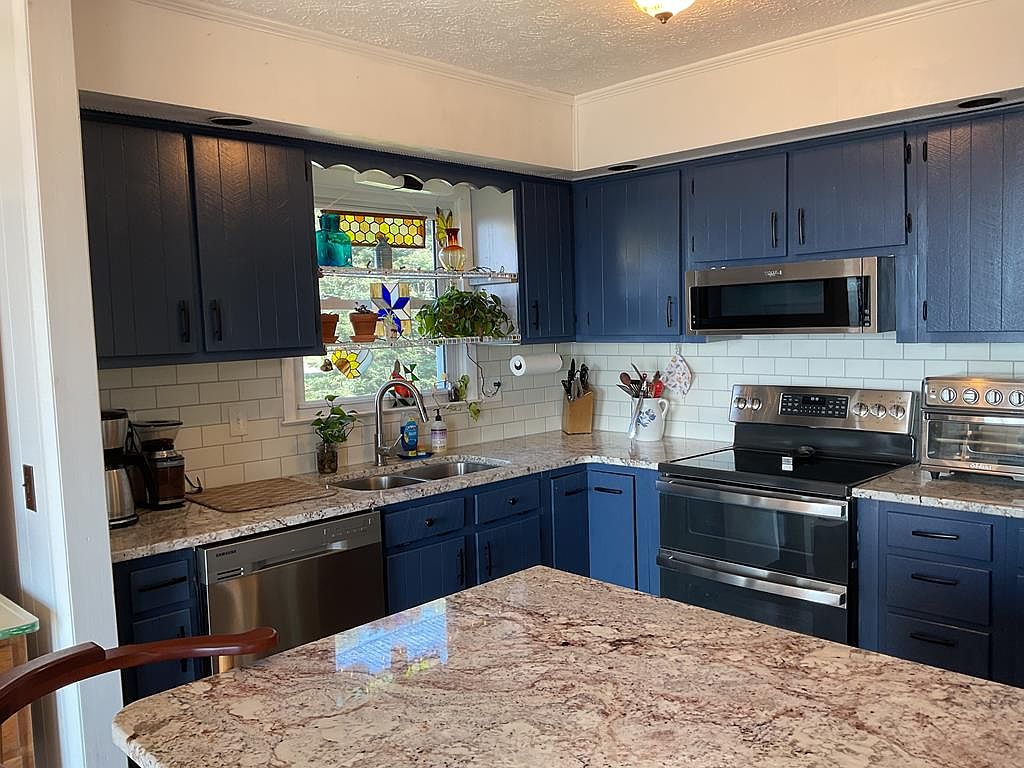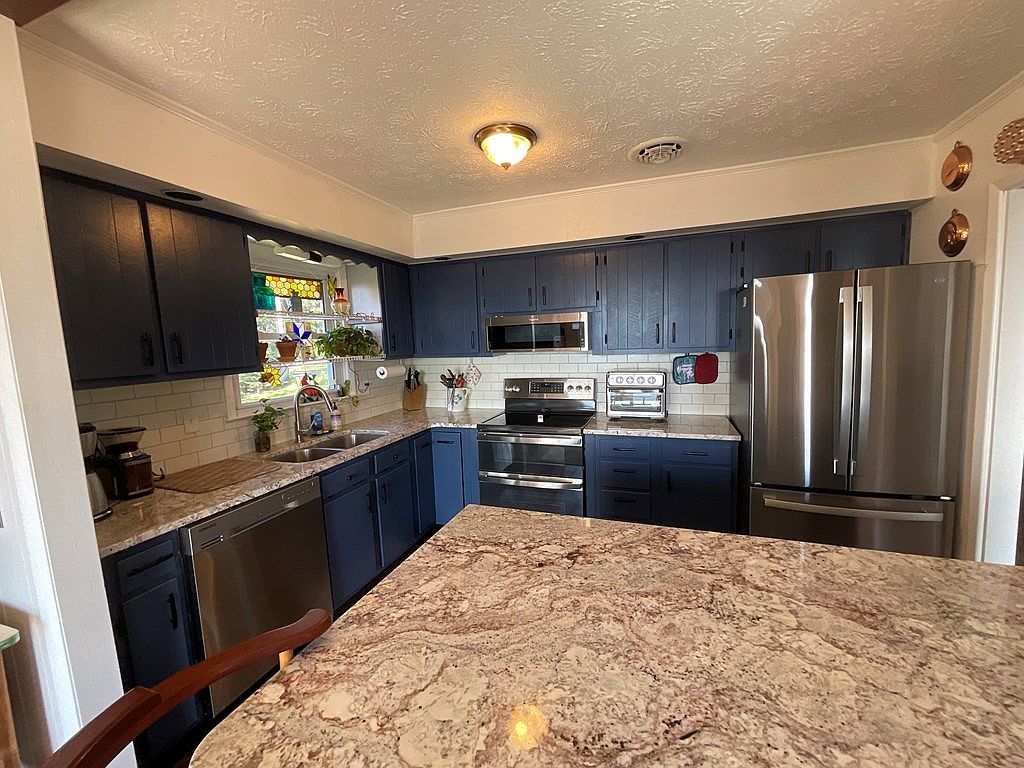The kitchen features a modern design with dark blue cabinetry contrasting against light-colored subway tile backsplashes. Stainless steel appliances, including a refrigerator, oven, and microwave, provide a sleek, contemporary touch. A spacious granite countertop offers ample workspace and is accompanied by an undermount sink. Natural light streams through a window adorned with a stained glass insert, adding a splash of color and personality. A carefully arranged assortment of potted herbs and decorative items enhance the lively atmosphere. The open layout allows for fluid movement, making the space functional yet inviting for cooking and entertaining.
