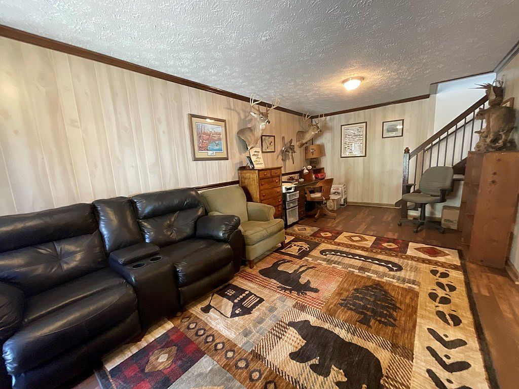 The room showcases a cozy living area with a mix of rustic charm and modern comfort. Leather reclining sofas in black flank a vibrant area rug featuring bears, trees, and wildlife motifs. The walls, clad in light wood paneling, provide a warm backdrop, enhanced by decorative frames and mounted animal heads that celebrate the outdoors. A small wooden desk, accompanied by a swivel chair, is positioned against the wall, while a staircase leads to the upper level, featuring wooden balusters. This space conveys a welcoming atmosphere ideal for relaxation and family interaction.