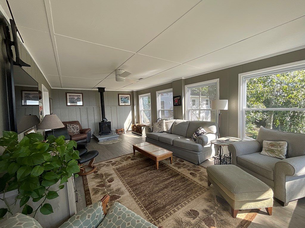 The living room features a spacious layout with large windows allowing ample natural light, creating a warm ambiance. The walls are painted in a soft gray tone, complemented by a wooden floor that adds a rustic charm. Central to the room is a seating arrangement with a light gray sofa adorned with decorative pillows, alongside a comfortable armchair in dark leather. A small wooden coffee table sits atop a textured area rug that adds warmth and pattern. A contemporary wood stove stands against one wall, while houseplants add a touch of greenery, enhancing the cozy, inviting atmosphere.