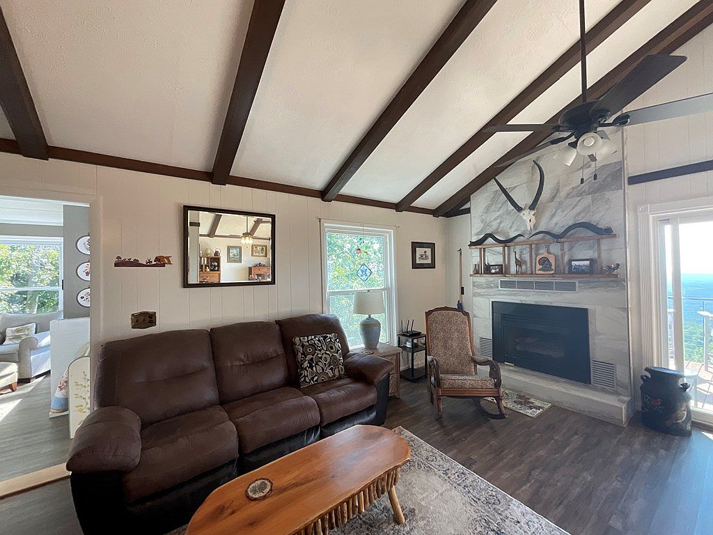 This cozy living room features a rich brown leather sectional sofa, accented with decorative pillows for comfort. A rustic coffee table made from natural wood adds warmth, while a patterned area rug defines the seating area. The vaulted ceiling, characterized by dark wooden beams, enhances the spacious feel. A stone fireplace, adorned with a mounted skull and decorative shelves, serves as a focal point. Natural light pours in through large windows, illuminating the serene environment. Artwork and family photos contribute a personal touch, creating a welcoming atmosphere ideal for relaxation and social gatherings.
