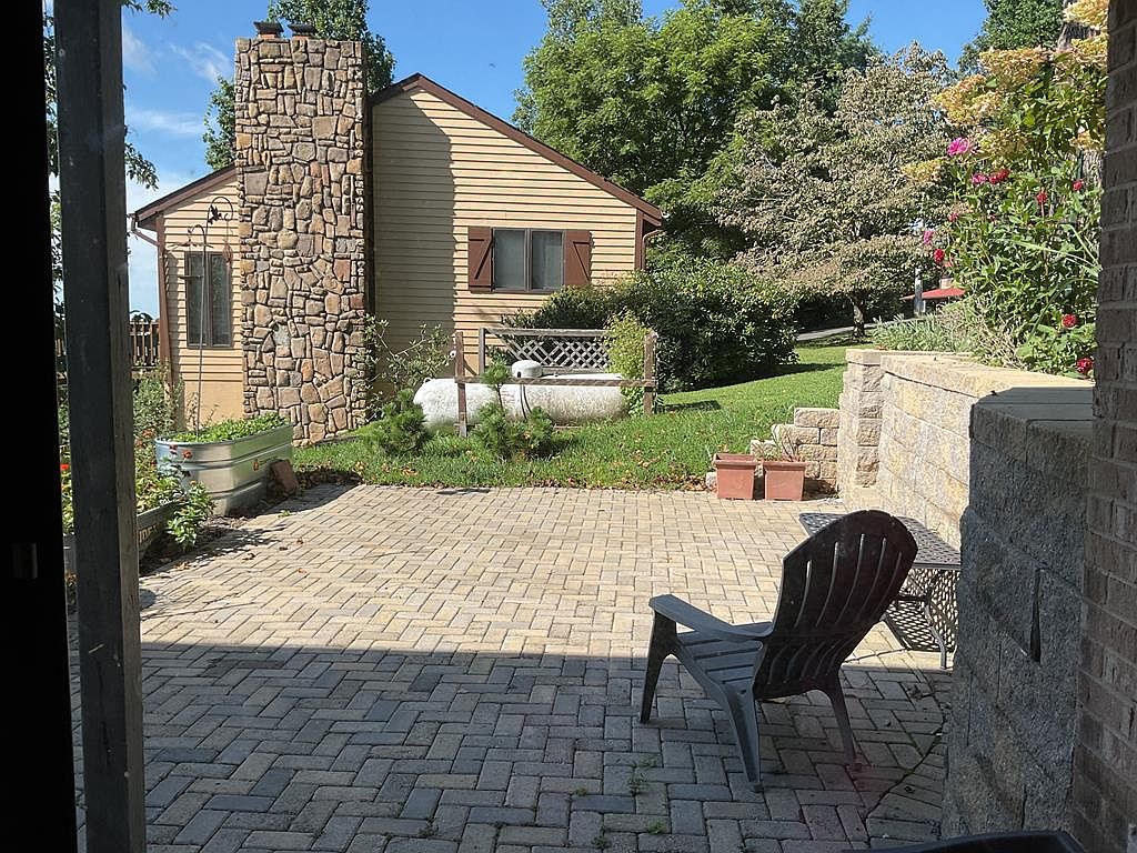 This outdoor patio features a spacious layout with interlocking pavers creating a warm, inviting atmosphere. A single black Adirondack chair adds a touch of rustic charm, while a stone wall provides structural interest and privacy. In the background, a charming historic home showcases a light brown exterior with dark brown shutters and a prominent stone chimney. Lush greenery surrounds the space, punctuated by flowering plants in garden beds. Flower pots sit scattered around, enhancing the natural beauty. The scene is bathed in natural light, promoting a serene outdoor retreat perfect for relaxation and enjoyment.