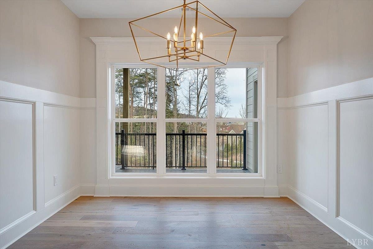 This bright office space features a modern aesthetic with a clean design. The room is adorned with a geometric gold chandelier that hangs centrally, providing a touch of elegance. Light-colored walls with subtle texture and white wainscoting create an airy feel. Large windows framed by sleek trim invite ample natural light and offer a scenic view of the surrounding landscape. A rich, warm hardwood floor contrasts beautifully with the light walls, enhancing the room’s warmth. The open layout keeps the space inviting and functional, ideal for productivity while enjoying a connection to the outdoors.