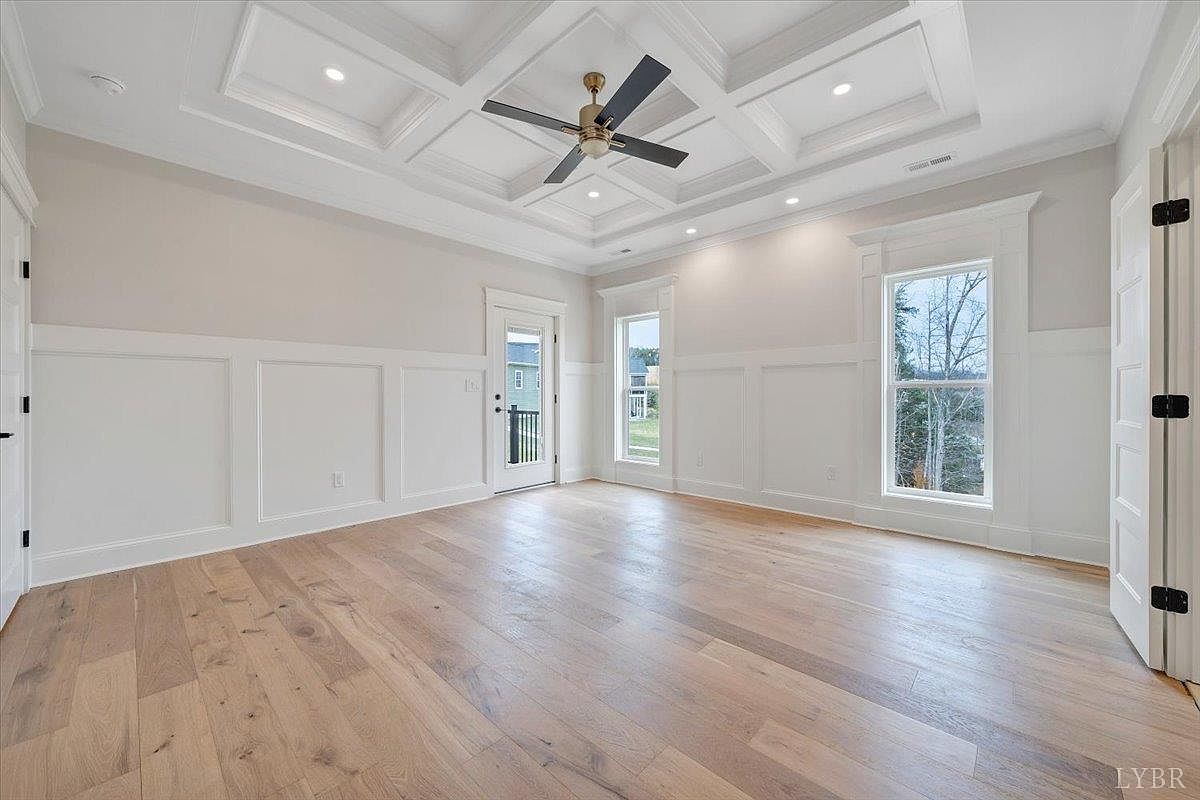This spacious master bedroom features a stunning coffered ceiling that adds depth and elegance. The walls are painted in a soft, neutral hue, complemented by crisp white wainscoting that creates a sense of height and sophistication. Large windows on two sides flood the room with natural light, framing beautiful outdoor views. The rich, polished hardwood flooring brings warmth and a modern touch to the space. A stylish ceiling fan with a brushed gold finish serves both functional and aesthetic purposes, enhancing the tranquil ambiance. The overall design emphasizes openness, inviting relaxation and comfort.