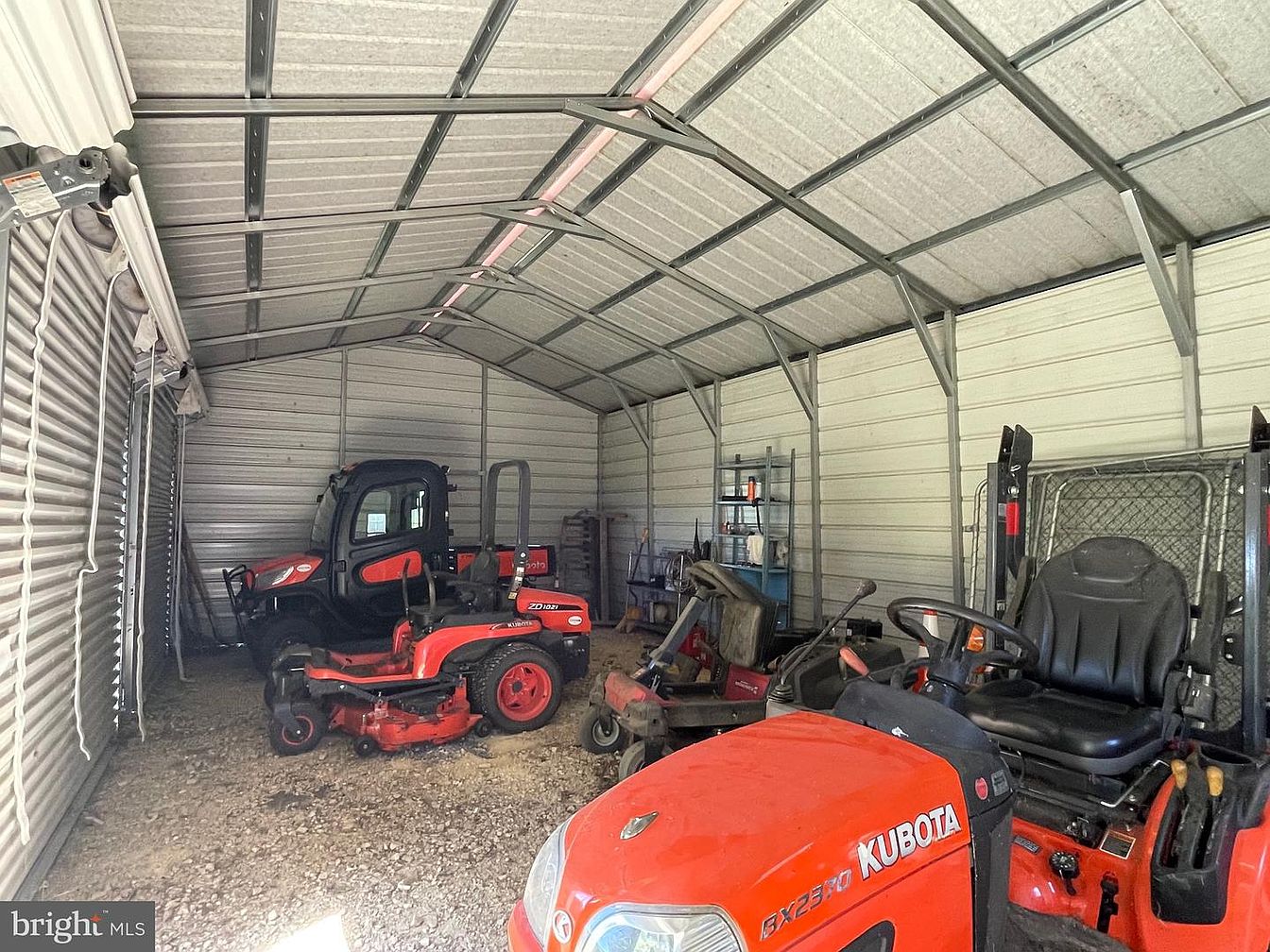 This space serves as a practical equipment shed, characterized by a spacious layout that accommodates various tractors and machinery. The interior features a metal structure with a high ceiling and galvanized walls, enhancing durability. The predominant color scheme includes vibrant reds from the Kubota machinery, contrasted with the steel gray of the structure. Shelving units line one side, organized with tools and supplies, adding functionality to the space. The gravel floor assists with drainage, while the large opening allows for easy access. Overall, the design emphasizes utility and efficiency, suited for farm or landscaping equipment.