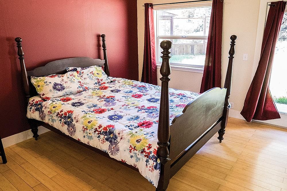 A cozy bedroom with a rich burgundy accent wall creates a warm atmosphere. The centerpiece is a beautifully crafted four-poster bed, showcasing dark wood with elegant turned posts. It is adorned with a vibrant floral-patterned bedspread, featuring a colorful mix of reds, yellows, blues, and greens. Natural light streams in through two windows dressed in sheer red curtains, enhancing the inviting feel. The flooring is light-colored wood, adding contrast to the darker elements. In the background, a glimpse of greenery outside adds freshness, making the space feel connected to nature while remaining a serene retreat.