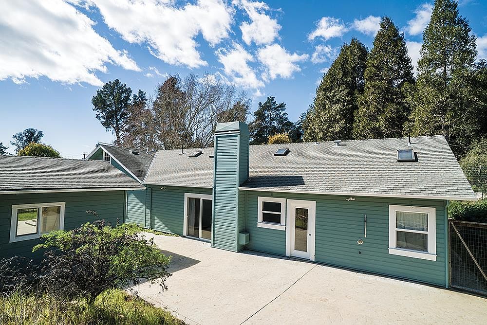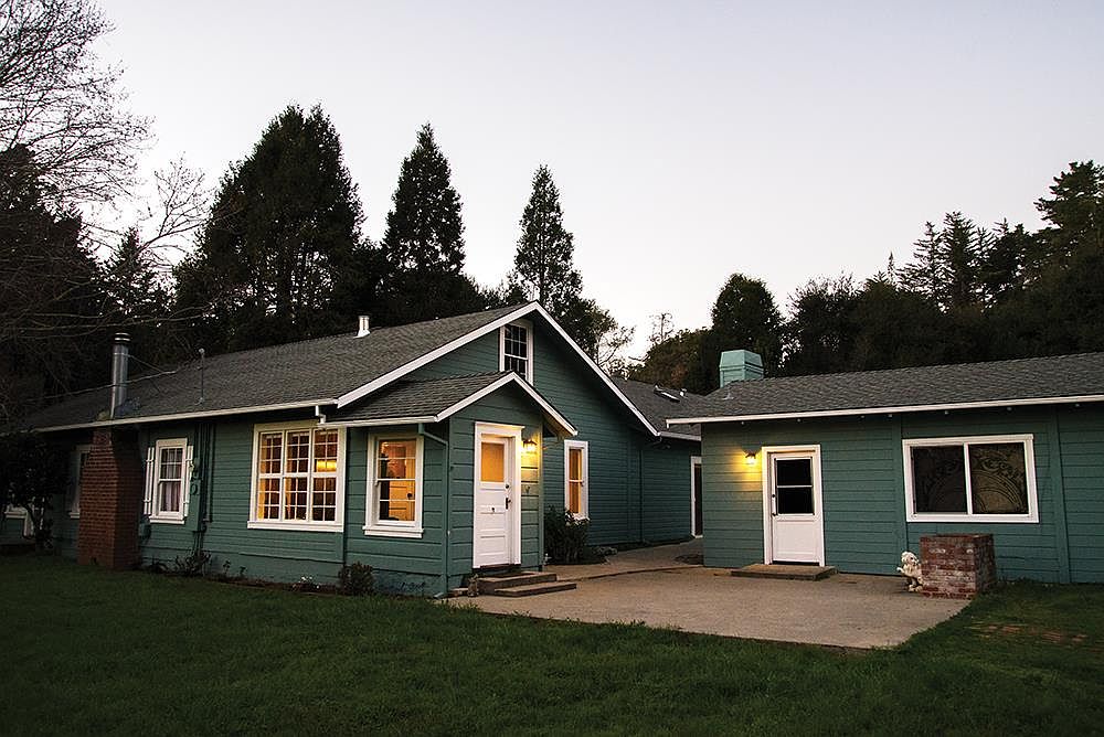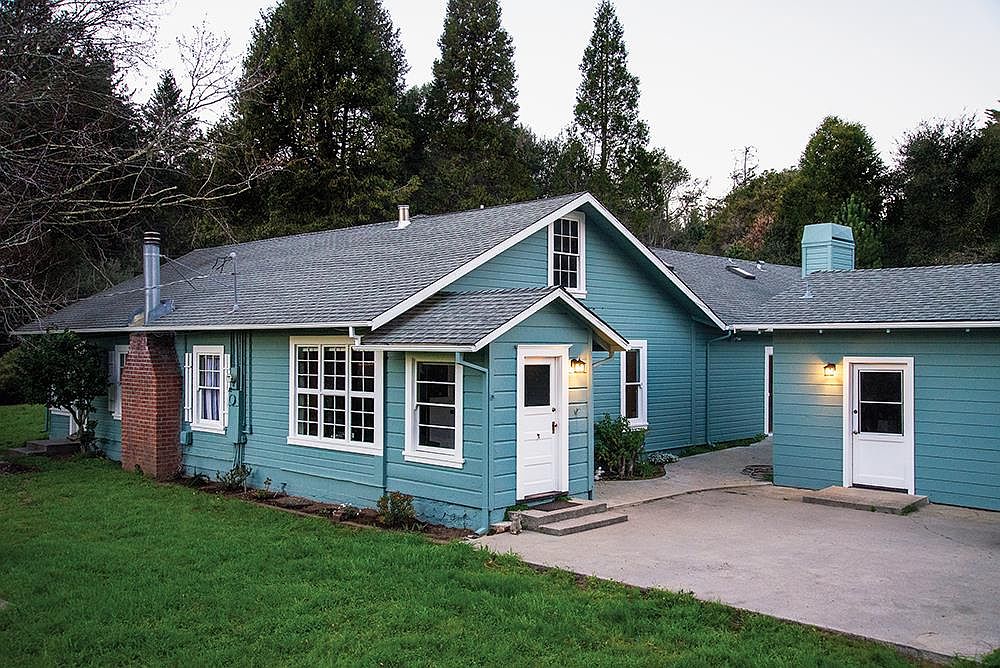 The image showcases the exterior of a historic American home featuring a charming two-tone green color scheme. The sloped roofs are accented by skylights, enhancing natural light. A central chimney adds character to the facade, while large windows invite the outdoors in. The design embraces a blend of traditional and modern elements with simple, clean lines. Surrounding the house, tall trees provide privacy and a natural backdrop, promoting tranquility. The concrete patio area, with minimal landscaping, offers a clean, functional space for outdoor activities, emphasizing the home’s inviting atmosphere.