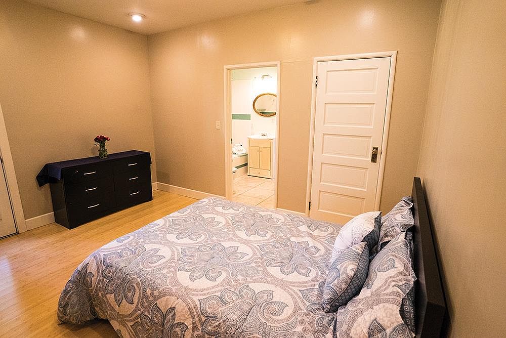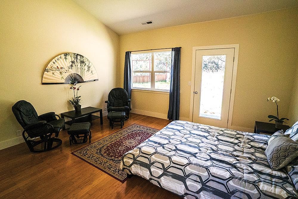 Bright and inviting bedroom featuring a queen-sized bed adorned with a geometric pattern comforter in monochrome shades. A sleek black nightstand holds a single white orchid, adding a touch of nature. A dark wooden chair complements the minimalist aesthetic. On the opposing wall, a large mirror reflects the space, enhancing the natural light from the nearby window. The warm bamboo flooring contrasts with the soft yellow walls, creating a cozy atmosphere. A subtle area rug in rich tones anchors the bed, providing warmth and texture. The layout feels open and functional, perfect for relaxation.