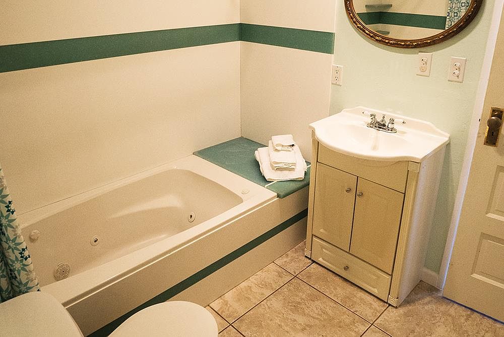 The bathroom features a blend of modern and traditional elements. A large, white jetted tub runs along one wall, accompanied by a teal accent ledge that adds a pop of color. The walls are adorned with soft white paint, accentuated by a horizontal teal stripe. Opposite the tub, a vintage-style vanity with a creamy finish and curved edges houses a polished sink with chrome fixtures. Neatly folded white towels rest on the teal ledge, enhancing the room’s inviting atmosphere. A round, ornate mirror reflects light, further brightening the space, while tan tiled flooring adds warmth to the overall aesthetic.