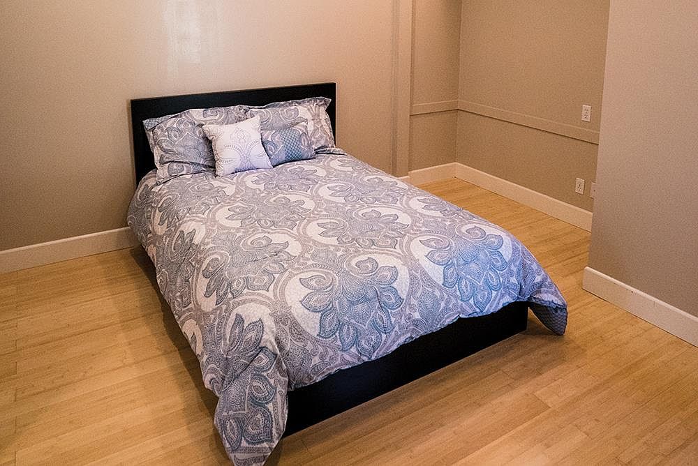 The bedroom showcases a minimalist layout with a focus on comfort. A queen-sized bed, adorned with a light blue and white paisley-patterned comforter, contrasts softly against the neutral beige walls. Two patterned accent pillows accompany a central solid-colored pillow, enhancing the bedding’s visual appeal. The flooring consists of light hardwood, contributing warmth to the space. Architectural elements include a subtle baseboard and a clean, simple trim that emphasizes the room’s airy atmosphere. The lack of clutter and decor highlights the tranquility of this space, making it inviting and restful.