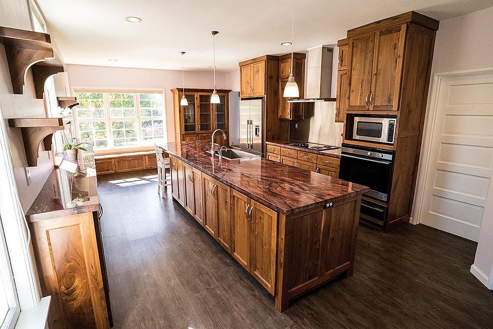 This kitchen features a spacious layout with rich wooden cabinetry and a striking maroon countertop that adds luxurious warmth. A large stainless steel refrigerator and a built-in oven seamlessly integrate modern appliances with rustic aesthetics. Two pendant lights hang elegantly above the kitchen island, providing ample illumination over the breakfast seating. Light wood flooring complements the warm tones of the cabinetry, while the light walls keep the space bright and welcoming. Shelving above the countertop displays potted plants and decorative items, enhancing the homey vibe. The open layout leads into another room, suggesting a flowing living space.