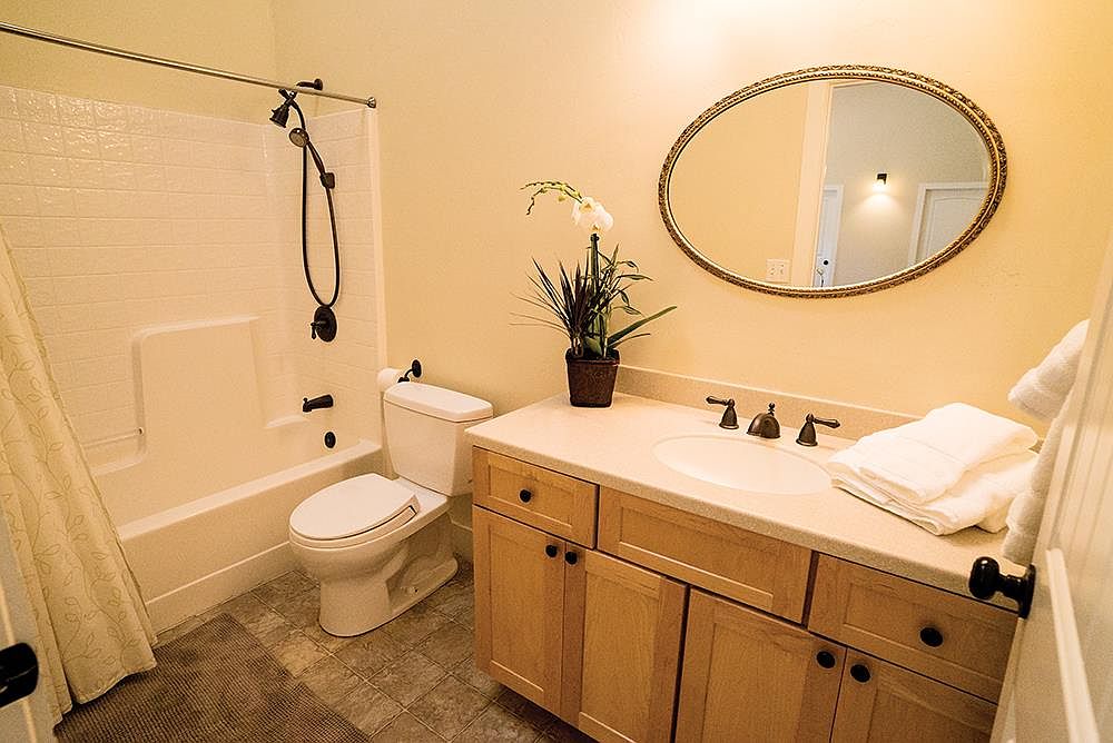 This bathroom features a clean, functional layout with light beige walls, creating a warm ambiance. A white tub-shower combination showcases subtle white tiling, accented by a sleek black showerhead and controls. Adjacent to the tub, a modern toilet complements the space, promoting a minimalist aesthetic. A double vanity with light wooden cabinetry offers ample storage, topped with a smooth, neutral countertop. Elegant fixtures in a dark finish add sophistication, while a large oval mirror enhances the sense of space and light. A potted plant introduces a touch of greenery, balancing functionality with a hint of natural beauty.