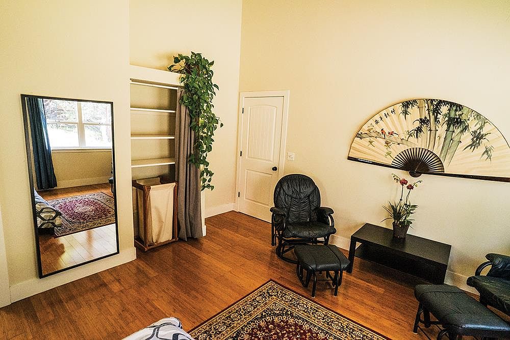 This cozy sitting area features warm wooden flooring and soft, neutral walls that create an inviting atmosphere. A large floor mirror reflects natural light, enhancing the sense of space. A decorative folding fan adorns one wall, showcasing elegant bamboo-themed artwork. Two black, comfortable chairs with matching ottomans encourage relaxation, while a sleek, dark coffee table holds a vibrant floral arrangement. To the side, a set of shelves adds functionality, and a stylish curtain softly frames a window, allowing glimpses of the outside. The area is minimalistic yet thoughtfully curated, blending comfort with aesthetic appeal.