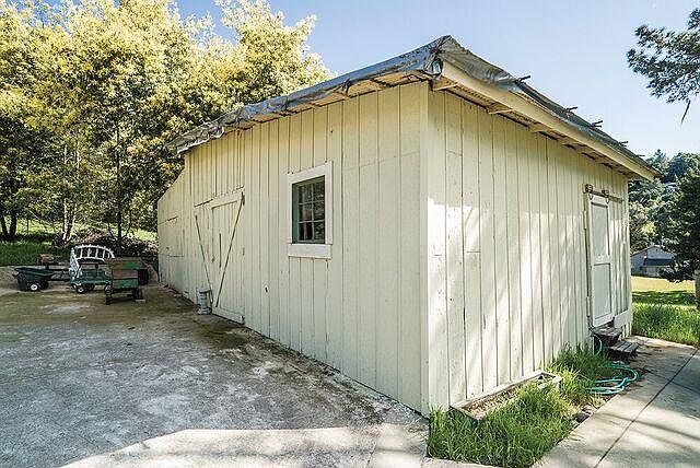 The image showcases the exterior of a quaint outbuilding, characterized by a light yellow, weathered wooden facade. The roof, slightly slanted, is covered with shingles, and the edges appear worn. Prominent features include a small window framed in white, enhancing the rustic charm. Double doors, also white-painted, are set into the wall, inviting a glimpse of the interior. Surrounding the structure is a concrete pathway leading to the building, bordered by patches of vibrant green grass, suggesting a well-tended outdoor space. Lush trees in the background add a serene, natural ambiance to this utilitarian yet charming building.