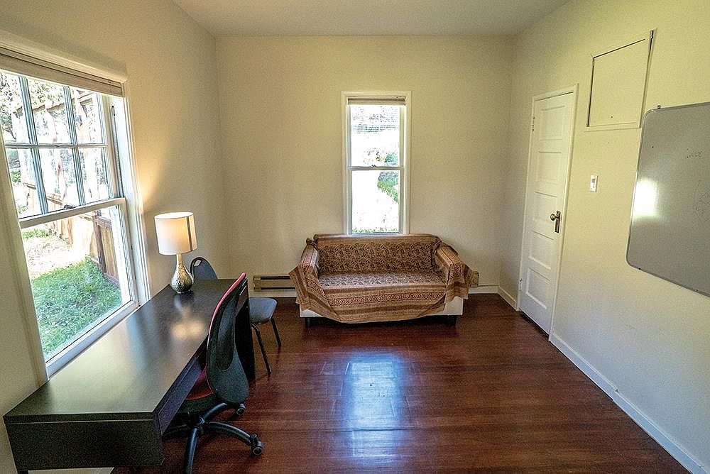 This home office features a balanced layout with a small brown couch adorned with a decorative fabric on one side, offering a cozy seating option. Across from it sits a sleek black desk paired with a modern ergonomic chair, perfect for productivity. Natural light streams through two large windows, illuminating the light beige walls and enhancing the warm wooden flooring. A simple table lamp adds a touch of warmth. A whiteboard on the side wall encourages organization and creativity. Overall, the space reflects a mix of functionality and comfort, ideal for focused work or study.