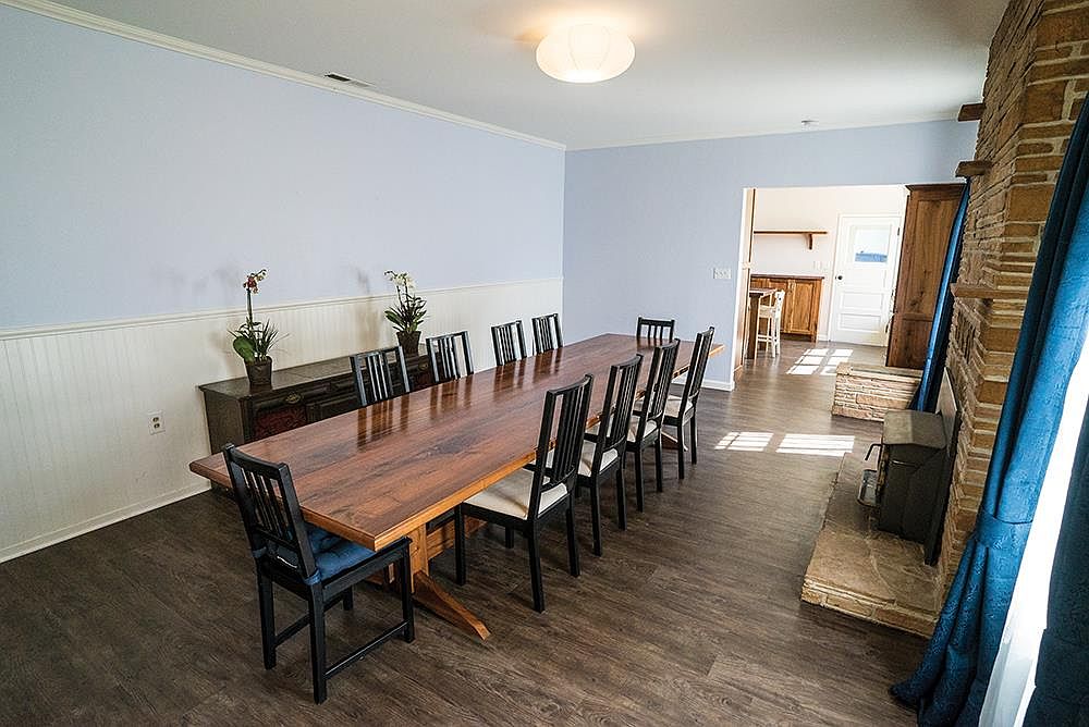 A spacious dining room featuring a long wooden table surrounded by black chairs with cushioned seats. Light blue walls create a calming atmosphere, complemented by white wainscoting that adds texture. Decorative plants on the side table bring a touch of greenery. A stone fireplace adds rustic charm, flanked by a warm-toned wood cabinet. Natural light streams through an adjacent doorway leading to the kitchen, enhancing the open layout. The flooring is a rich, dark wood, offering contrast to the lighter color scheme. Elegant curtains in a deep blue frame the windows, introducing a sophisticated accent to the space.